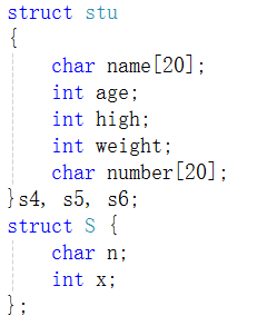 如上图,我们定义了两个结构体类型,第一个结构体类型struct stu中成员1为20个元素的字符数组,成员名为name,第二个成员的类型为整形类型,成员名为age,第三个和第四个成员的类型也为整形类型,成员名分别为high和weight,第五个成员为20个元素的字符数组,成员名为number,可以该结构体可以用来表示学生的基本信息,s4,s5,s6表示结构体名,可直接将结构体s4,s5,s6进行初始化。同理,结构体struct S有两个成员,字符型数据n,与int类型x。