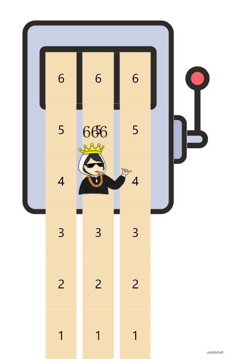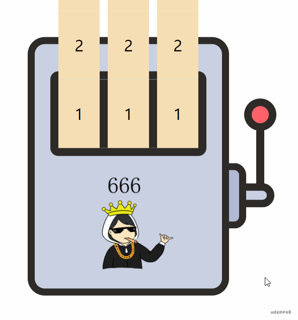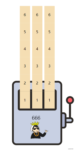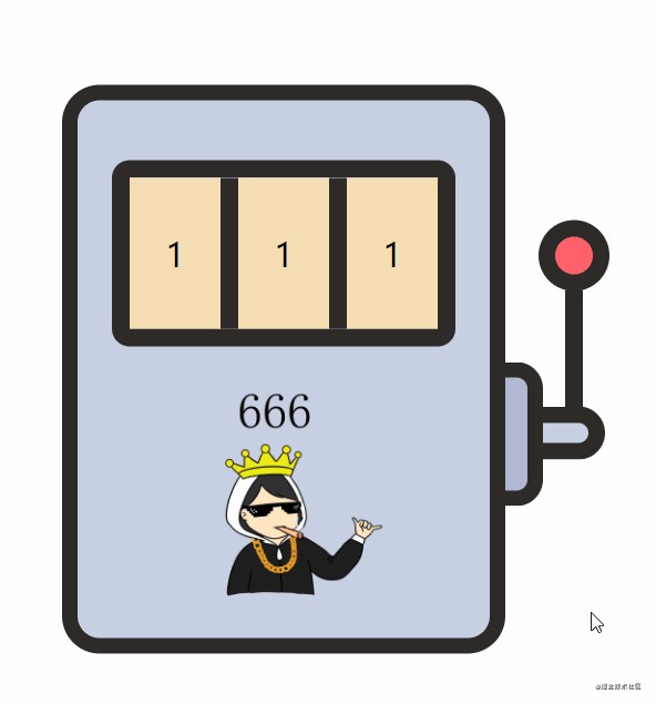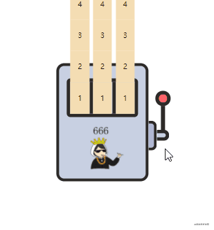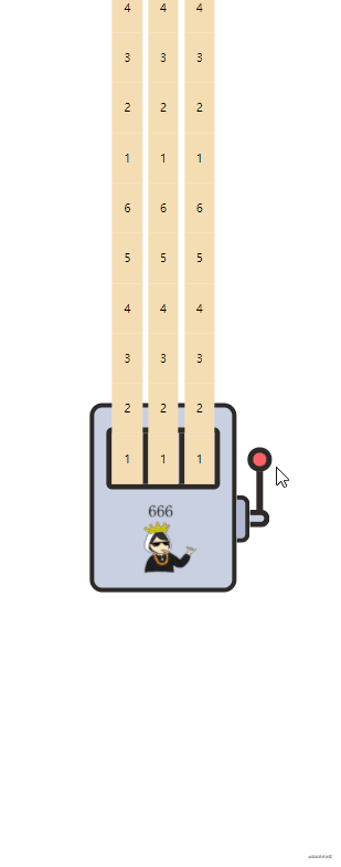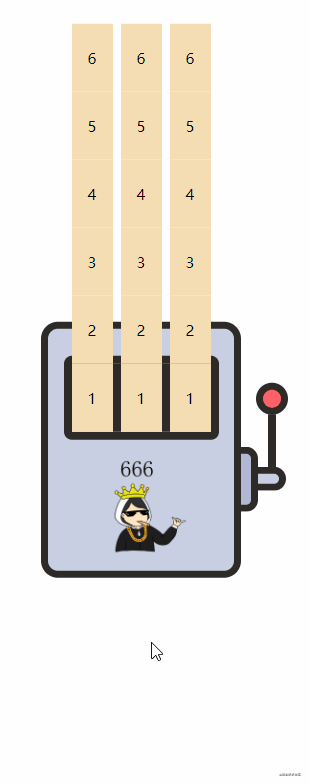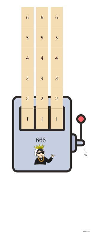 老虎机的整体外观样式还是比较好写的,对老虎机的外观布局如果有兴趣的话可以直接参考代码,小编就不一一介绍了。文章主要介绍的是老虎机中间三个小格子和机身动画的一些实现要点。(读者想实操的话也可以自己找一张背景图当作老虎机的背景,这里小编只是自己好奇而已所以就用各种基础布局和样式实现的老虎机)
