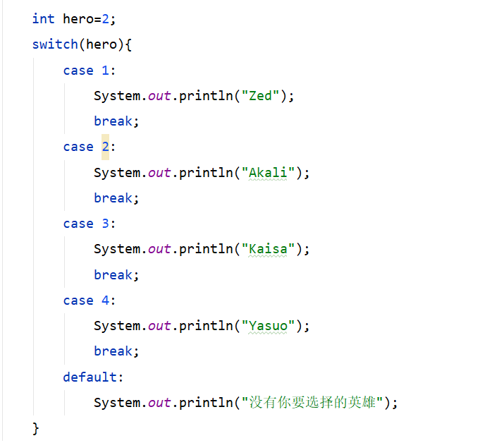 如果 switch 中的值没有匹配的 case, 就会执行 default 中的语句。