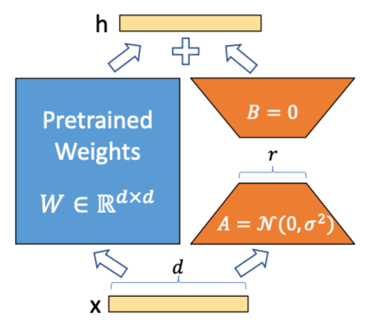 LoRA 的核心思想是将预训练模型的权重矩阵分解为两个低秩矩阵的乘积。假设原有矩阵权重为W微调过程中拆解成两个低秩矩阵A、B的乘积,冻结原有矩阵`+`两个低秩矩阵的乘积来适应新的任务。