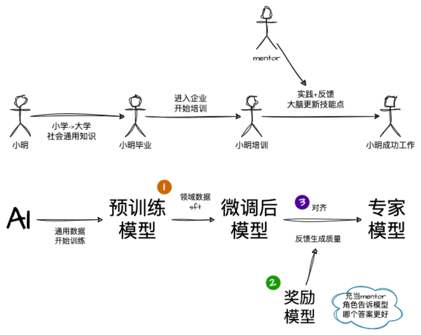 | 数据 | 海量无标注/弱标注的通用数据(TB级,如全网文本) | 少量任务相关的标注数据(MB/GB级,如几千条样本) |