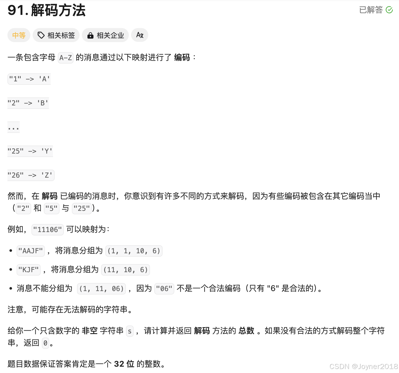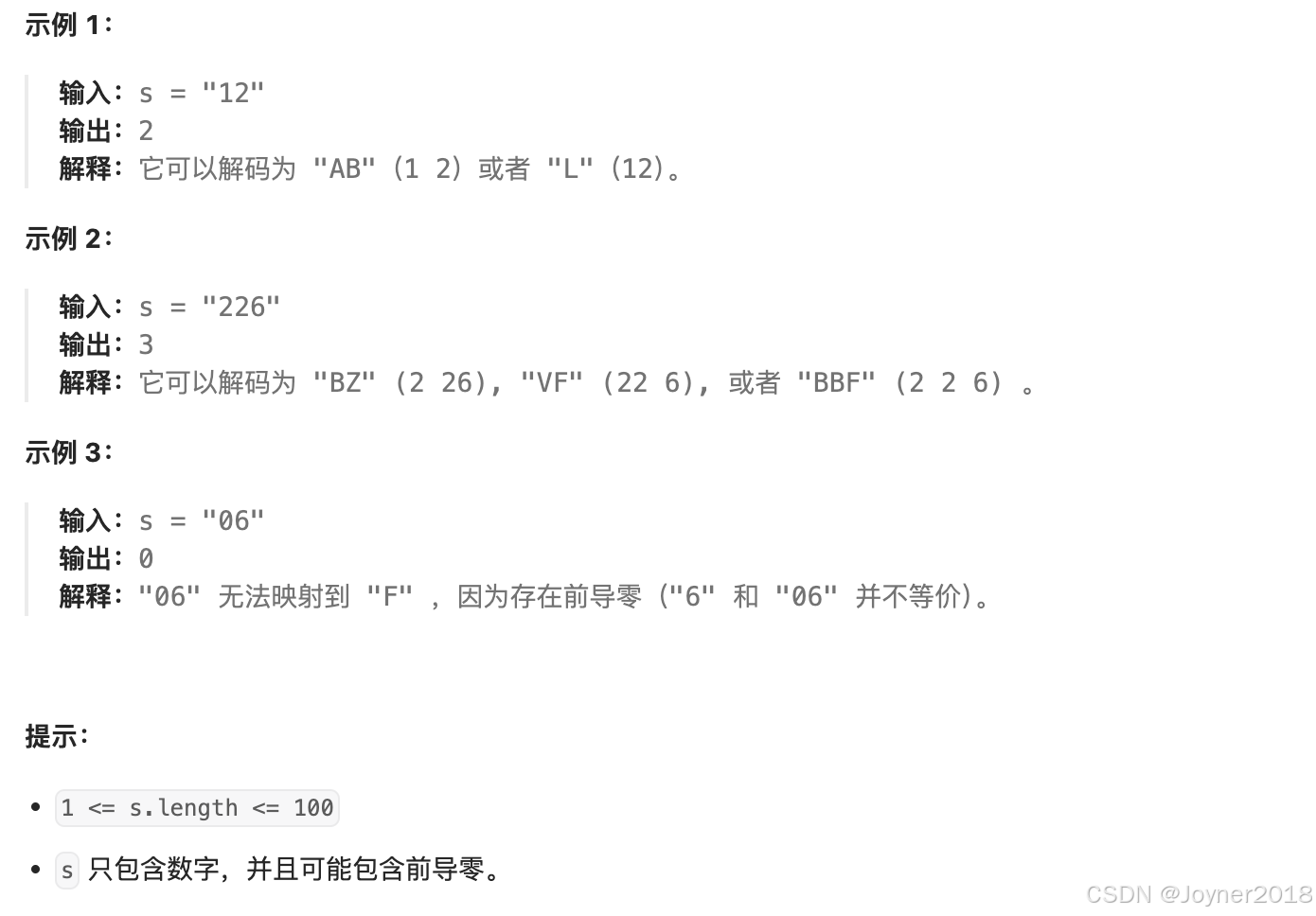 我们定义一个动态规划数组 dp,其中 dp[i] 表示以索引 i-1 结尾的字符串的解码方法总数。最终答案就是 dp[s.length()]。