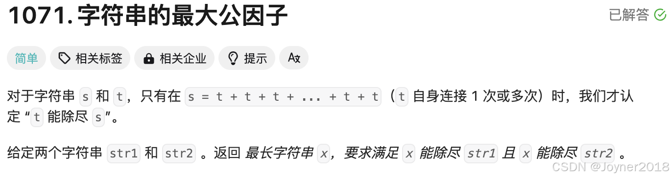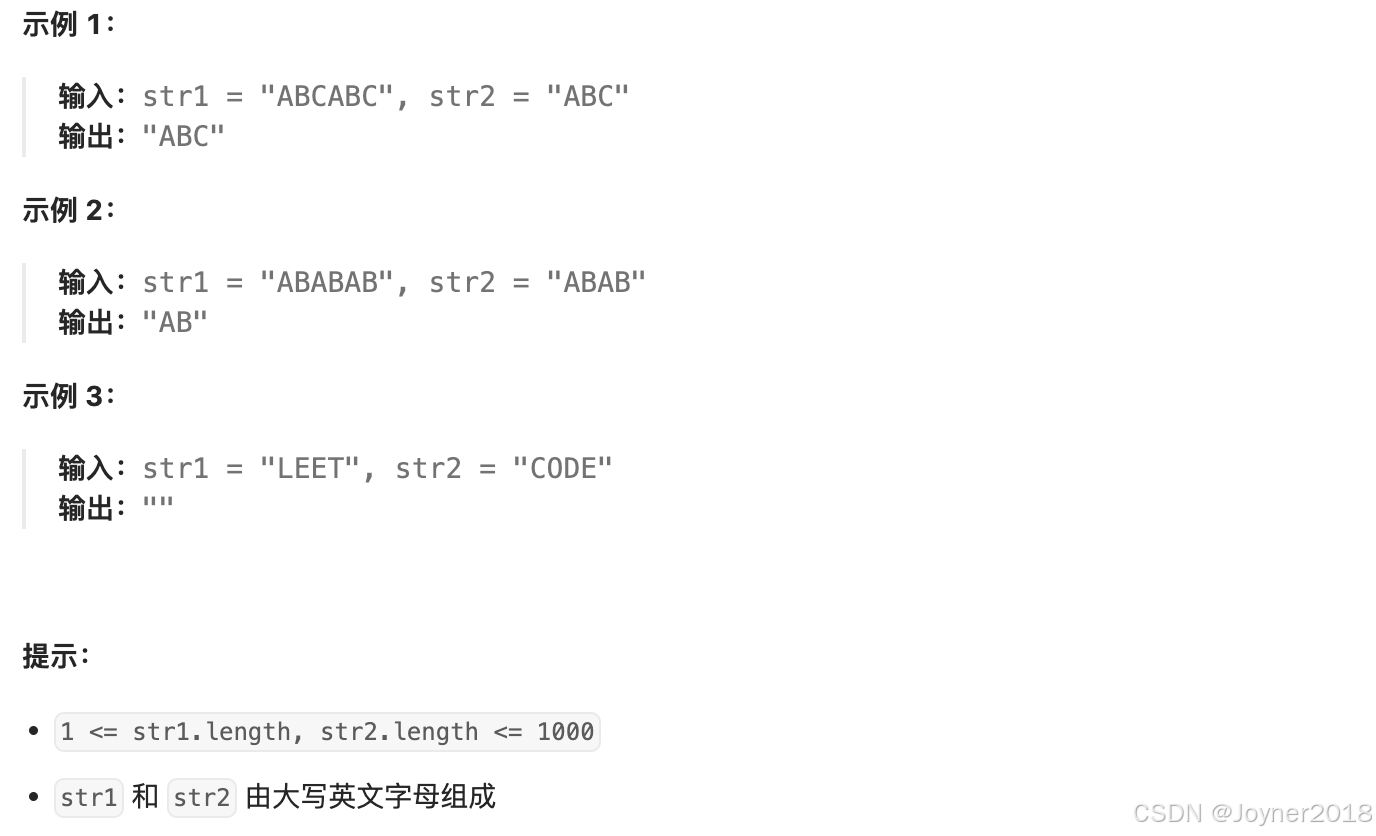 str1 + str2 == str2 + str1是判断str1和str2是否由相同的子串重复构成的关键。gcd(len(str1), len(str2))计算两个字符串长度的最大公因数。- 取