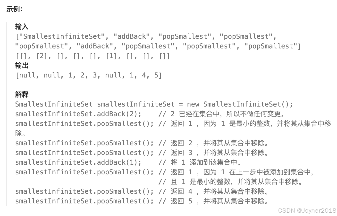 current_min记录当前最小的未被取出的正整数,每次popSmallest()后递增。min_heap是一个最小堆,存储被addBack(num)加回的数,保证popSmallest()取最小值。added_back是一个集合,防止重复加入堆中。popSmallest():- 如果