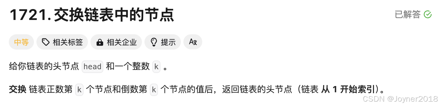 fast指针向前走,同时再使用一个second指针从head开始走,当fast到达链表末尾时,second指向的就是倒数第 k 个节点。 - 交换两个节点的值:直接交换它们的