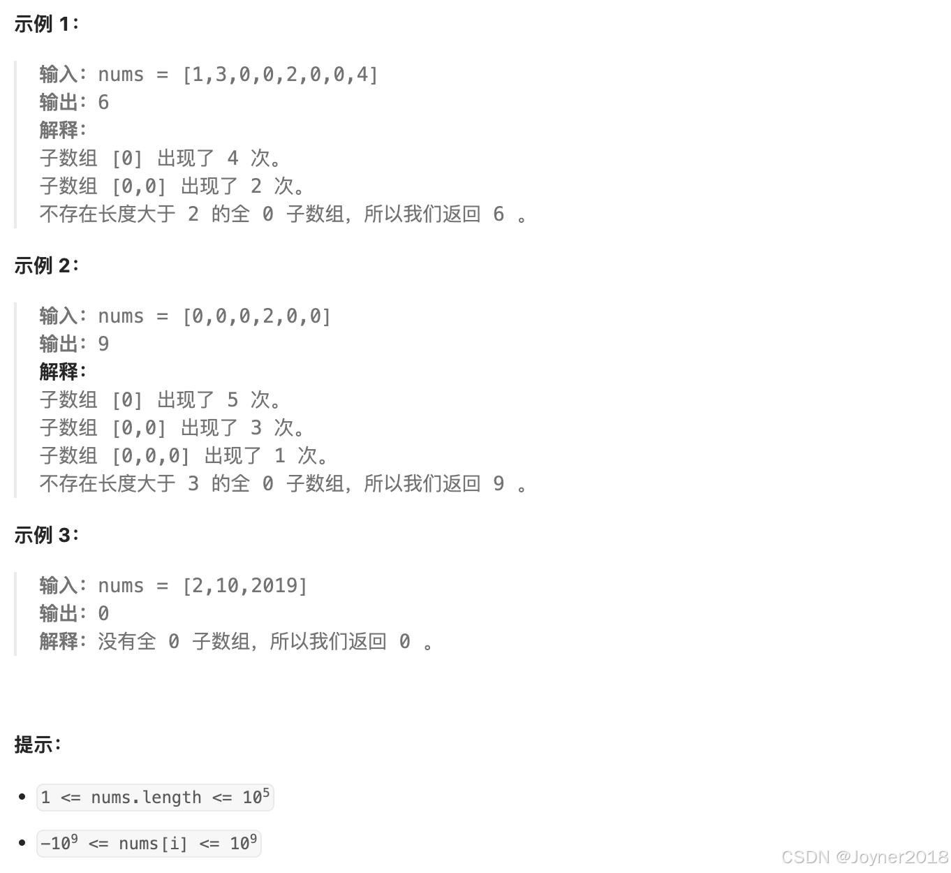 可以使用前缀和的方法来解决这个问题。由于我们需要统计所有元素为 0 的子数组数量,我们可以遍历数组,当遇到 0 时,计算以该 0 结尾的子数组数量,并累加到总数中。