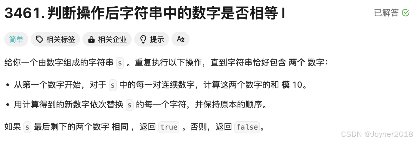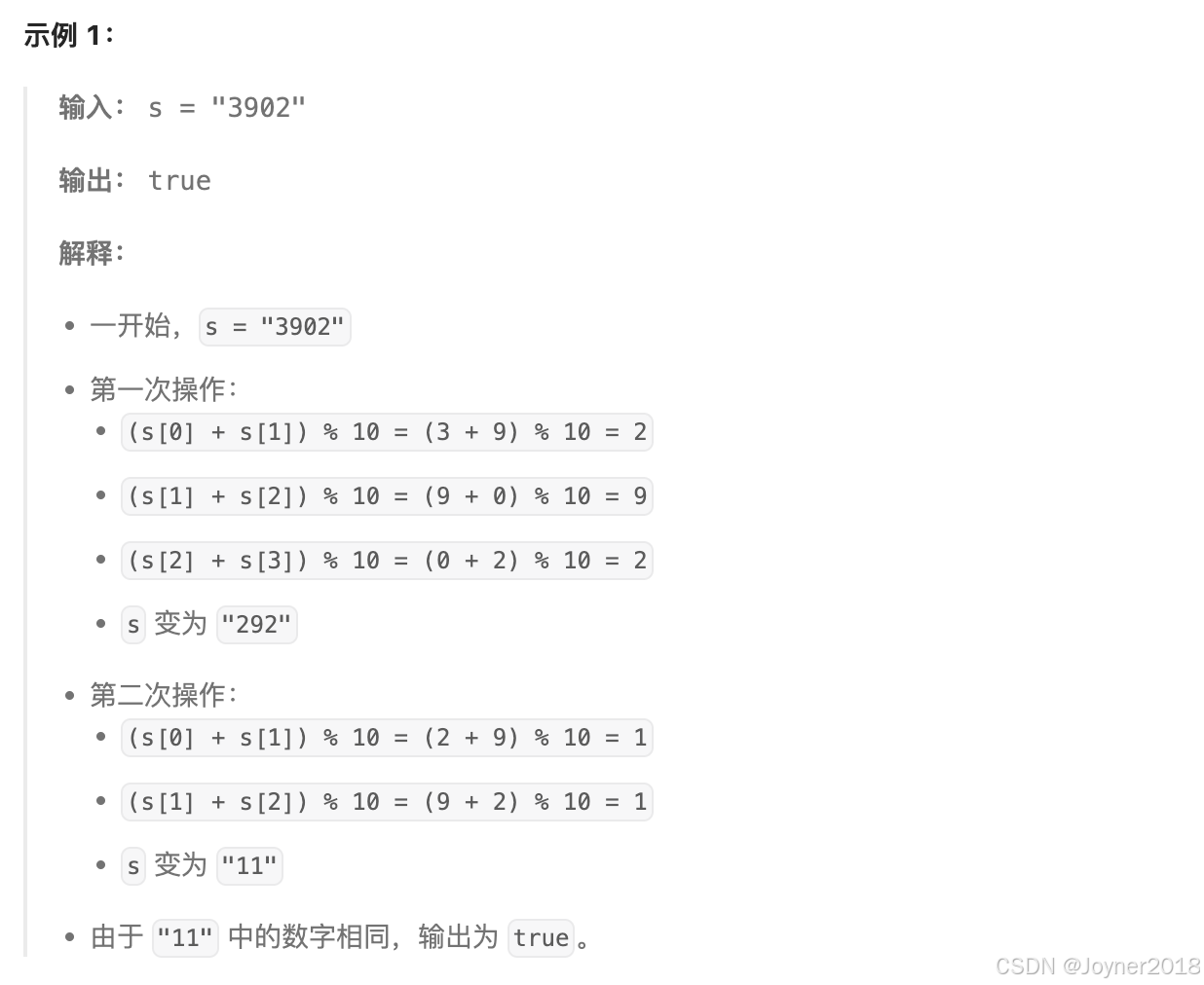 这个函数会不断地计算相邻数字的和取模 10,直到字符串长度缩短为 2。最后,它检查两个剩余的数字是否相等,并返回 True 或 False。你可以尝试不同的输入来验证它的正确性。