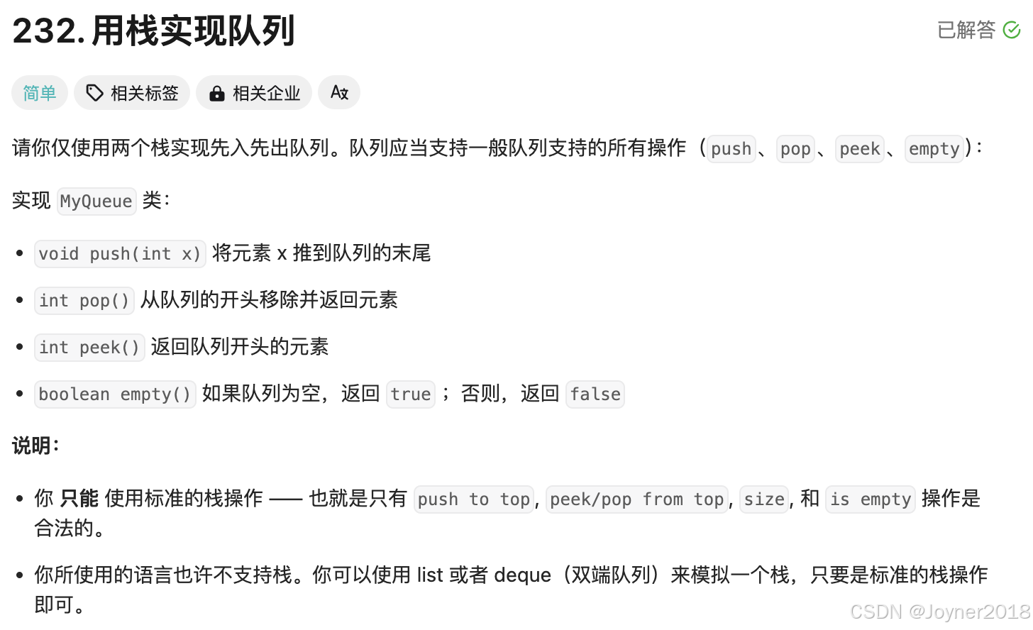 push(x): 直接将元素压入stack1。pop(): 如果stack2为空,则将stack1中的所有元素倒入stack2,然后弹出stack2顶部元素。peek(): 类似pop(),只是返回stack2顶部元素而不弹出。empty(): 当stack1和stack2都为空时,队列为空。