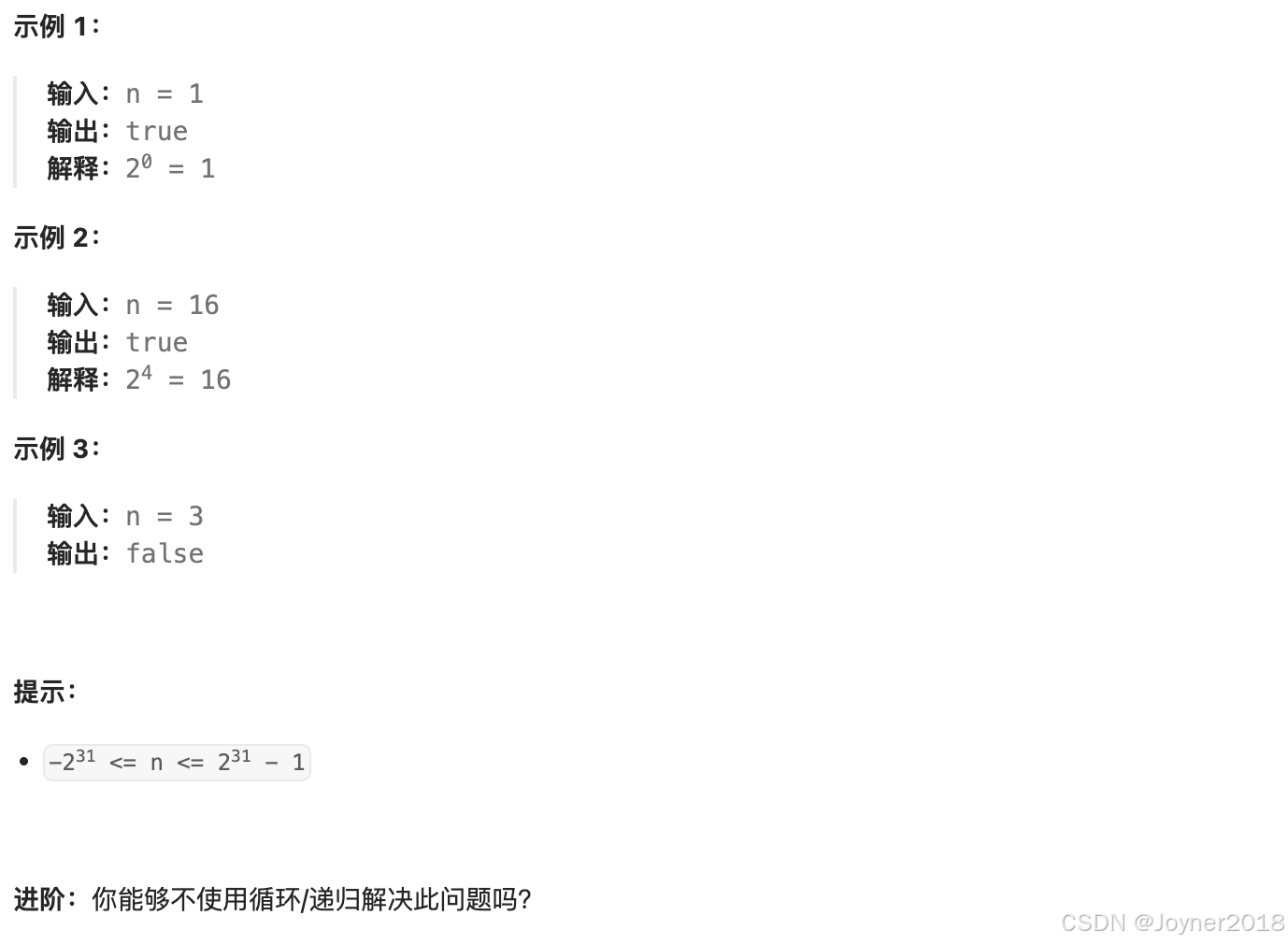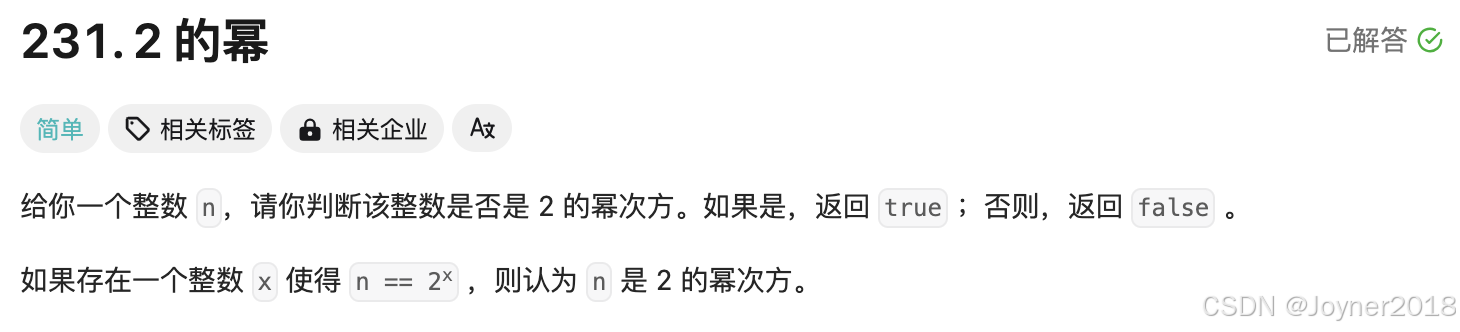 可以使用位运算来判断一个数是否是 2 的幂次方。具体来说,一个数 n 是 2 的幂当且仅当: