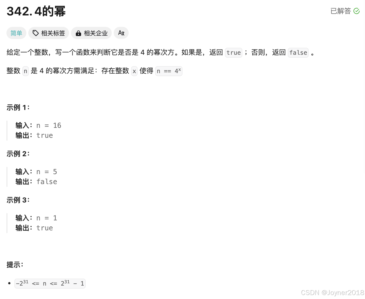 1位必须出现在奇数位,可以通过n & 0xAAAAAAAA == 0来确保(0xAAAAAAAA是二进制10101010...,用于排除 2 的幂中非 4 的幂的情况)。