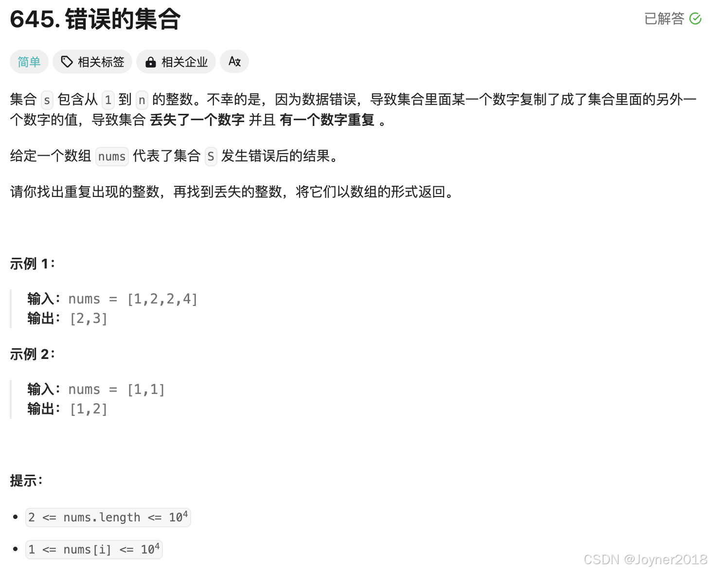 这个代码使用一个 set 来找到重复的数和丢失的数,时间复杂度为 O(n),空间复杂度也是 O(n)。如果想要优化空间,可以使用数学的方法(求和公式+求平方和公式)。如果你需要更高效的方法,欢迎讨论!