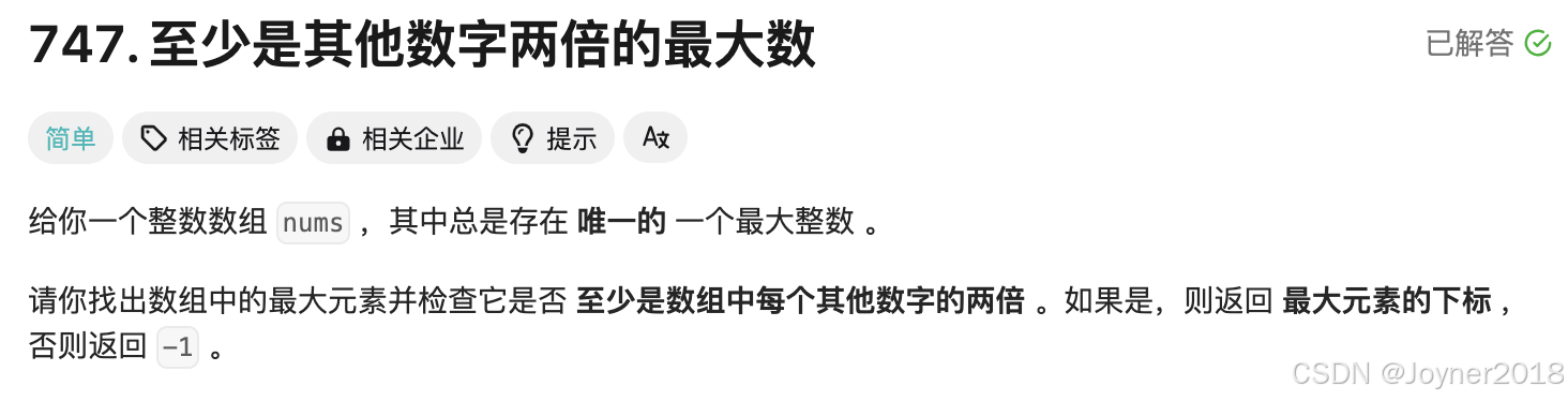 747. 至少是其他数字两倍的最大数 - 力扣(LeetCode)