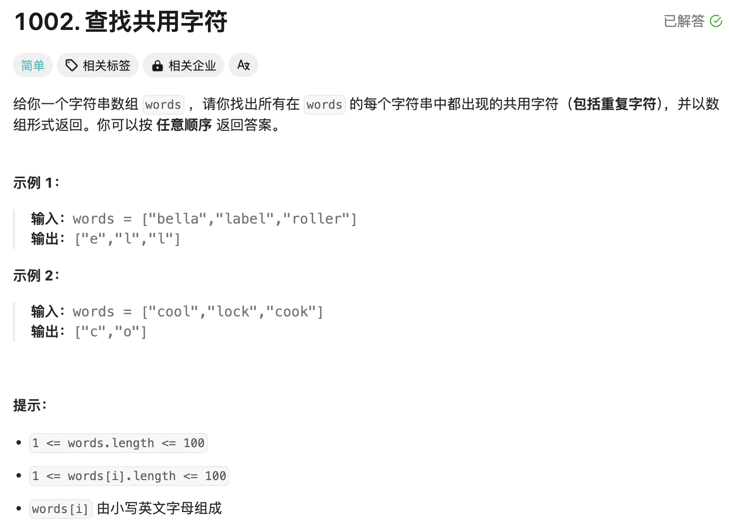 print(commonChars(words)) # 输出: ['e', 'l', 'l']