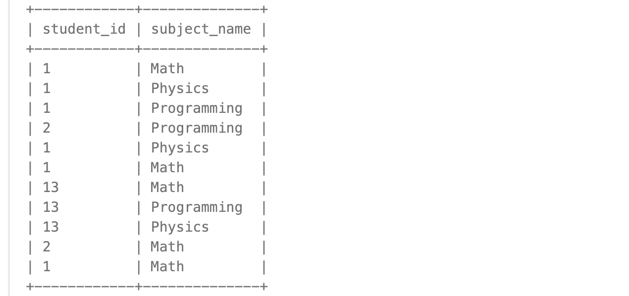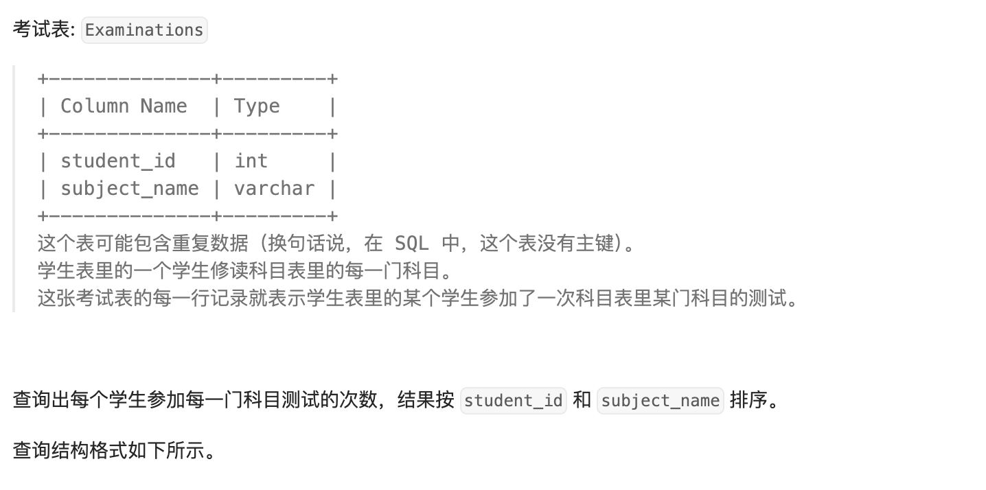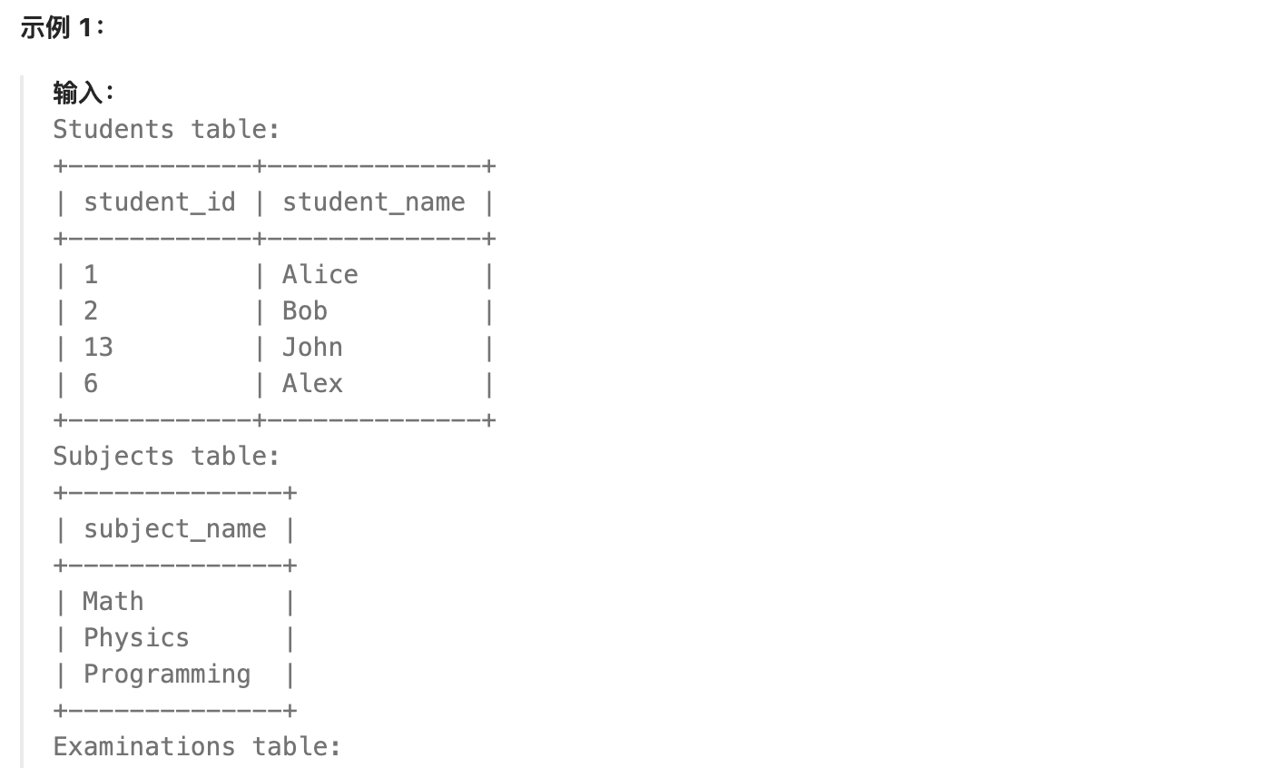 目标是查询每个学生和所有科目的组合(即即使某个学生没有参加某个科目的考试,也需要显示该组合),那么需要使用 笛卡尔积 来获取学生和所有科目的组合,并通过 LEFT JOIN 来获取每个学生参加考试的次数。