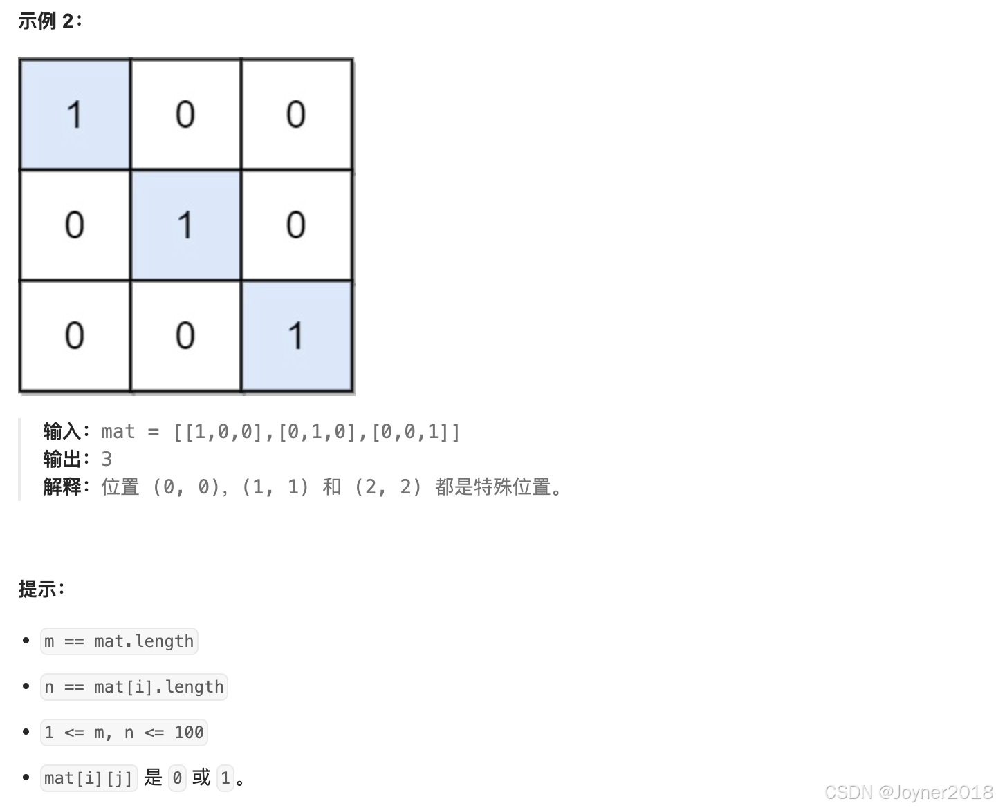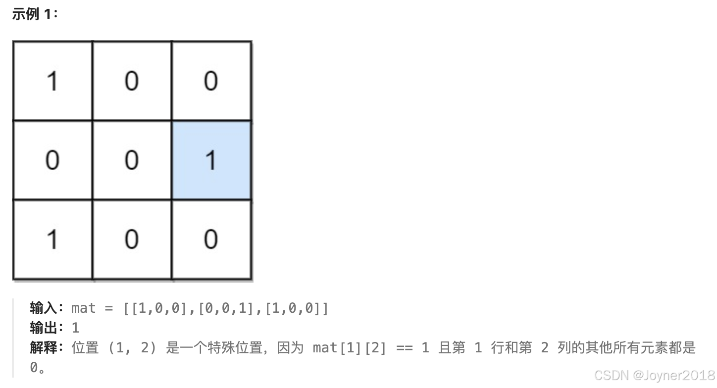 上述矩阵中,只有位置 (1, 2) 是特殊位置,因为它是 1 且其所在的行和列其他元素都是 0。