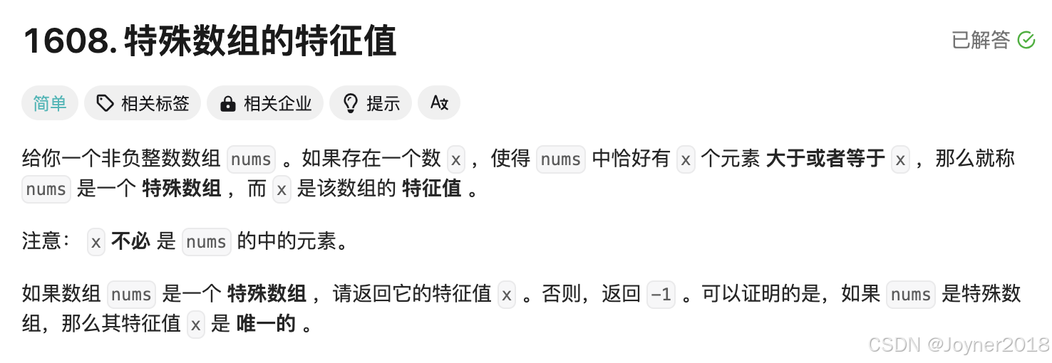 这个问题的关键在于枚举所有可能的特征值 x(从 0 到 len(nums)),然后检查是否恰好有 x 个元素大于等于 x。