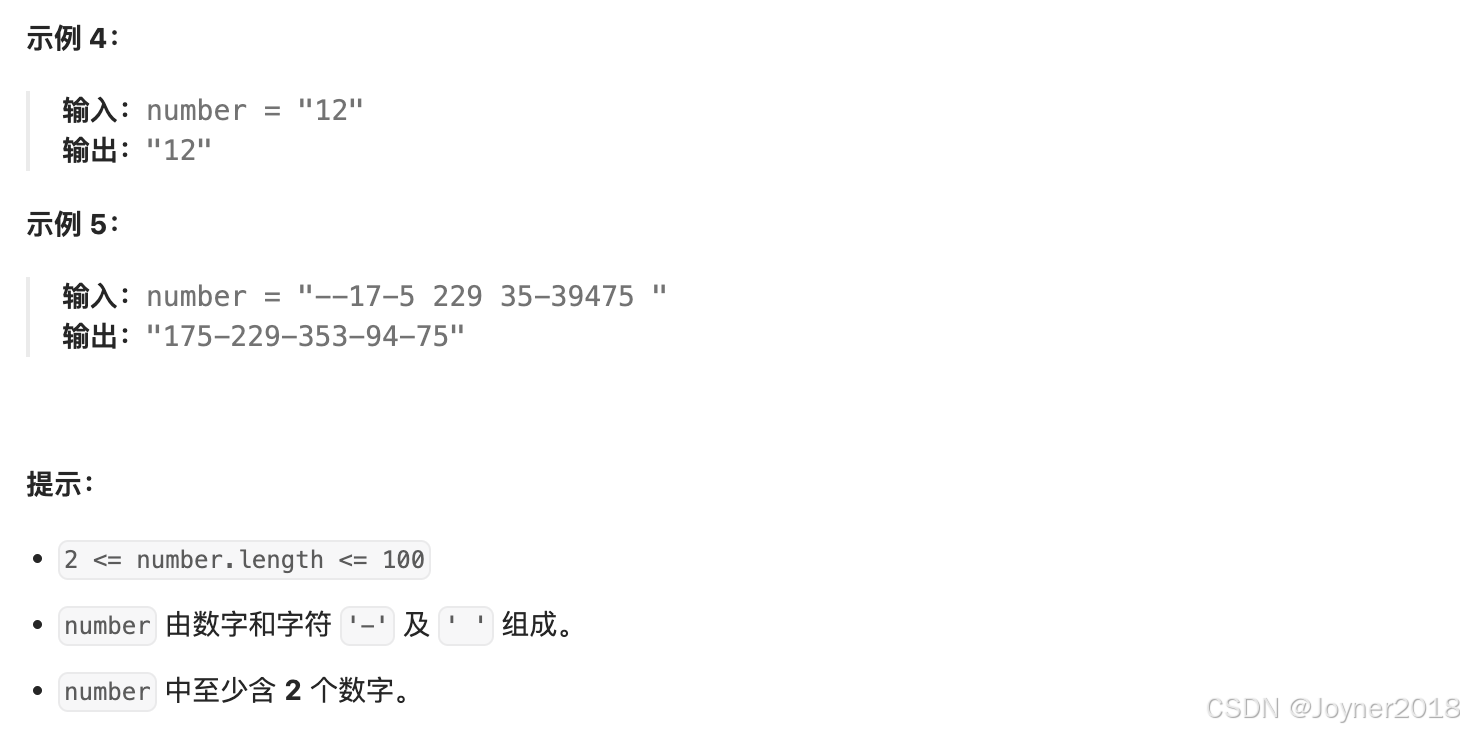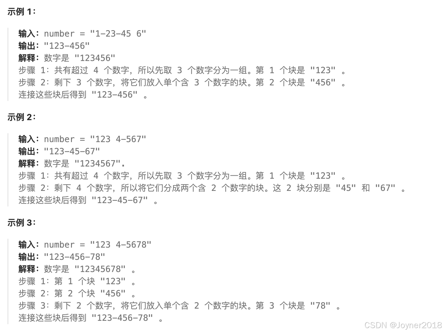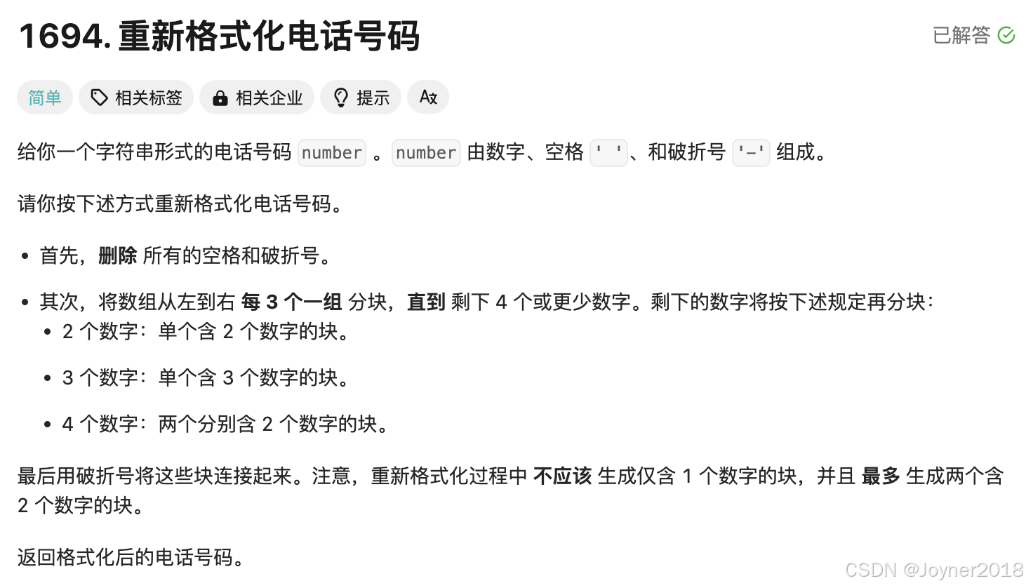这个问题要求对电话号码进行重新格式化,按一定规则分块,并且确保输出满足特定的格式要求。下面是该问题的解法: