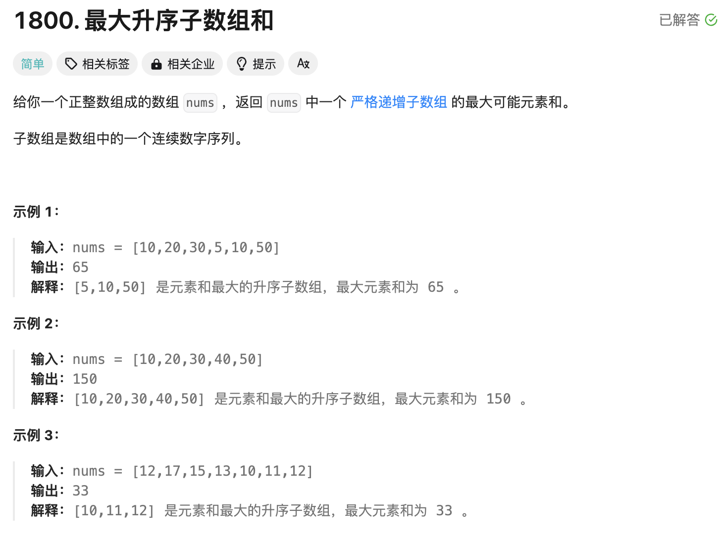 要解决这个问题,我们可以使用滑动窗口(或简单的遍历)来查找所有严格递增的连续子数组,并计算它们的元素和,返回其中的最大值。