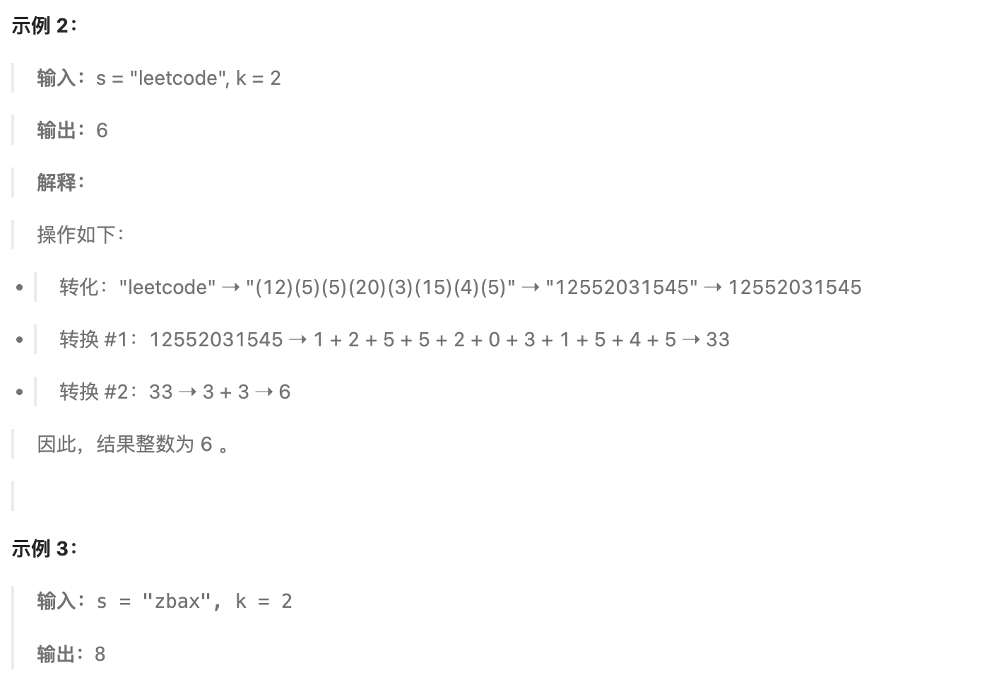 print(getLucky(s, k)) # 输出 8