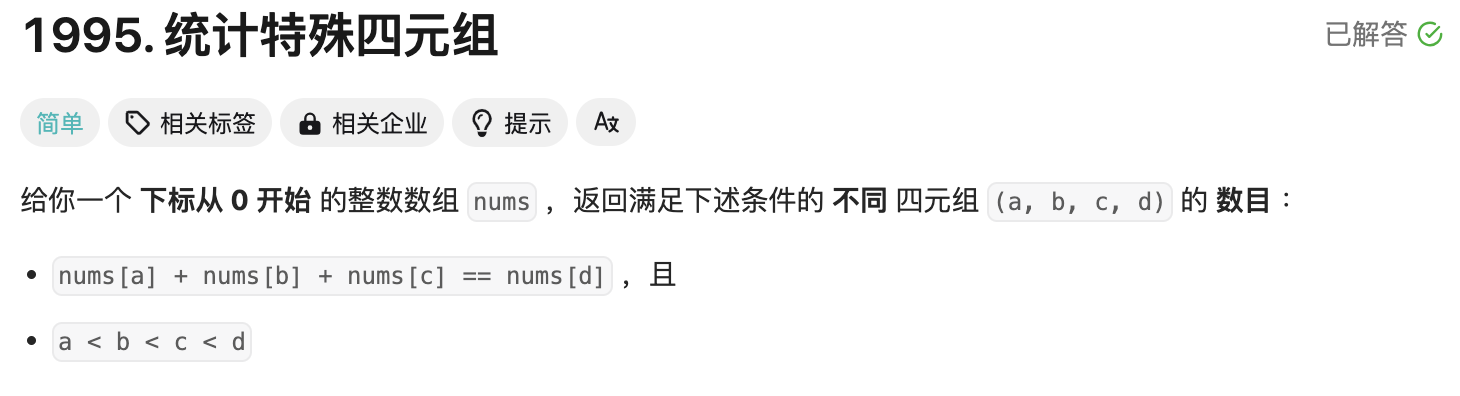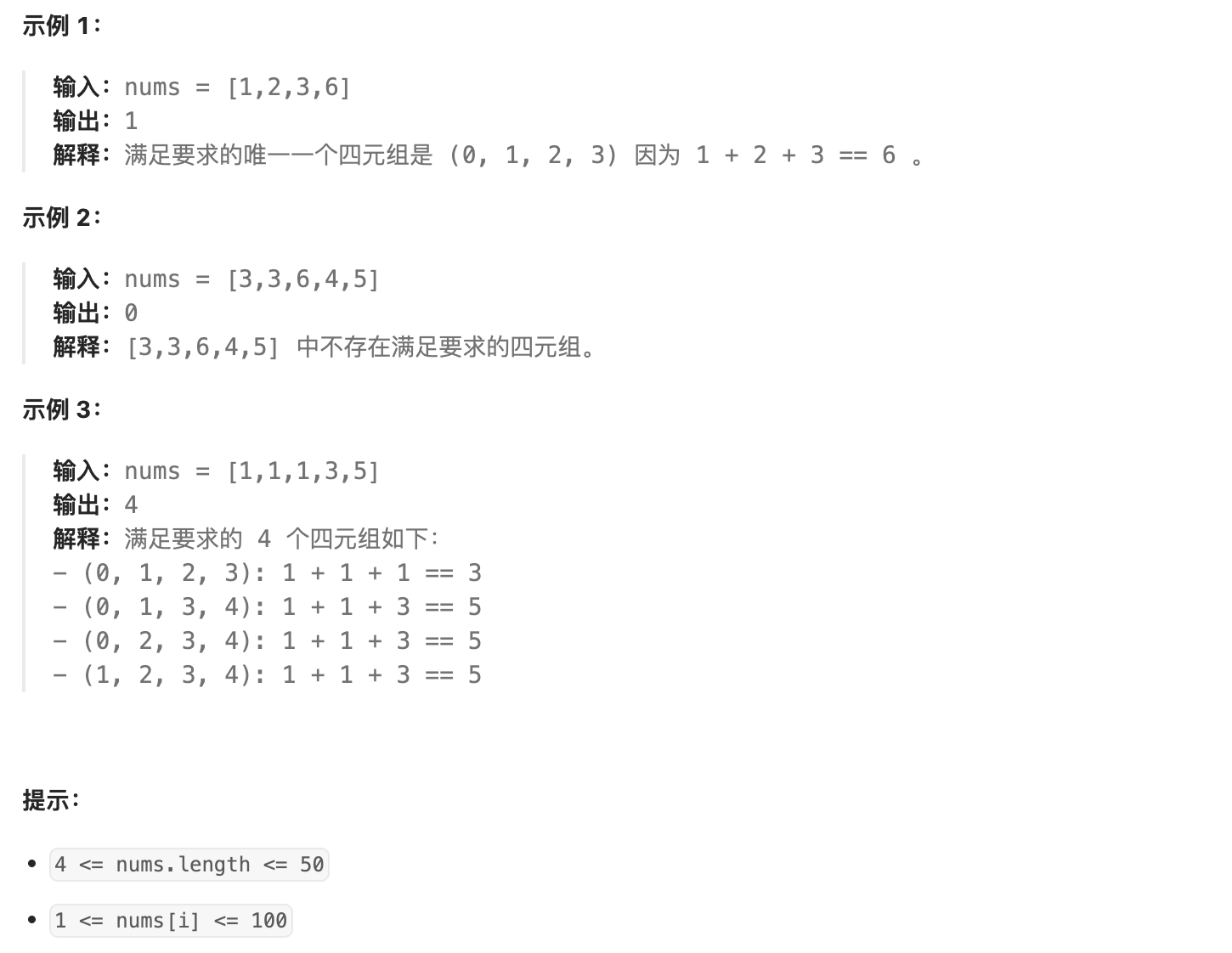 这个题目是一个四元组计数问题,要求找出所有满足 nums[a] + nums[b] + nums[c] == nums[d] 且 a < b < c < d 的四元组数目。