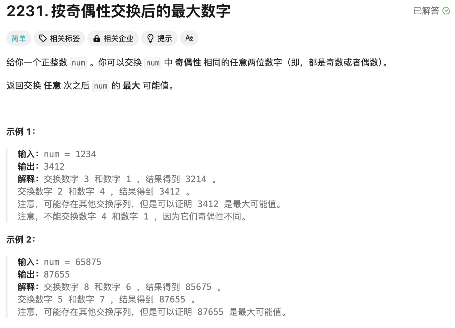 我们要从给定的整数 num 中通过 任意次数的相同奇偶性数字的交换,得到一个最大的可能值。