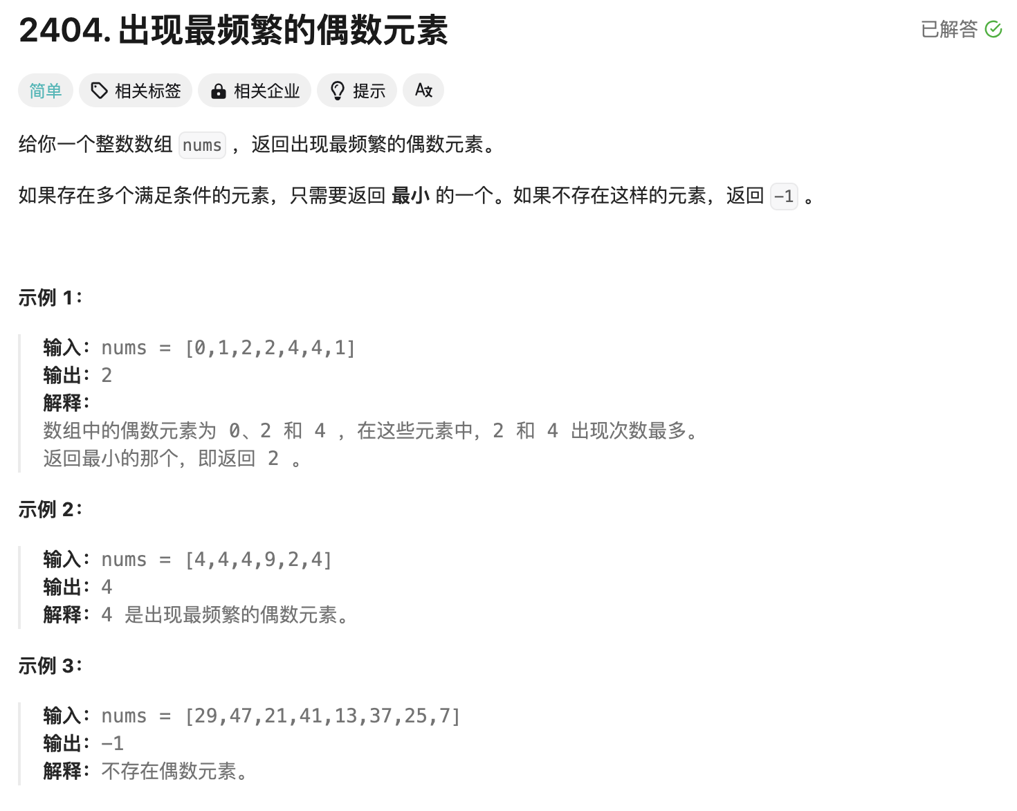 2404. 出现最频繁的偶数元素 - 力扣(LeetCode)