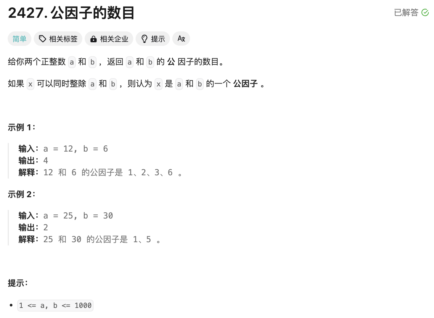 要找两个正整数 a 和 b 的 公因子的数目,我们可以按照以下步骤来解决问题: