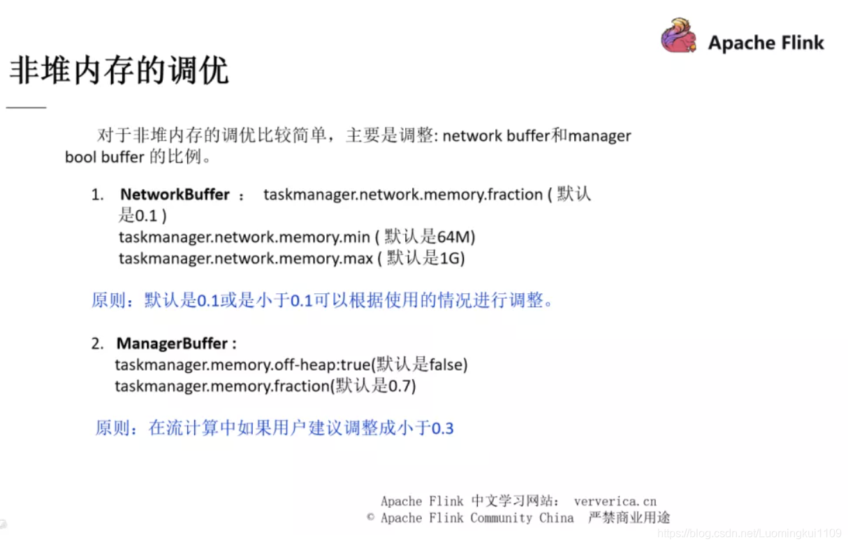 这些参数我们都需要结合自身的情况去进行调整,这里只给出一些建议。而且对于 ManagerBuffer 来说,Flink 的流式作业现在并没有过多使用到这部分的内存,所以我们都会设置得比较小,不超过0.3。