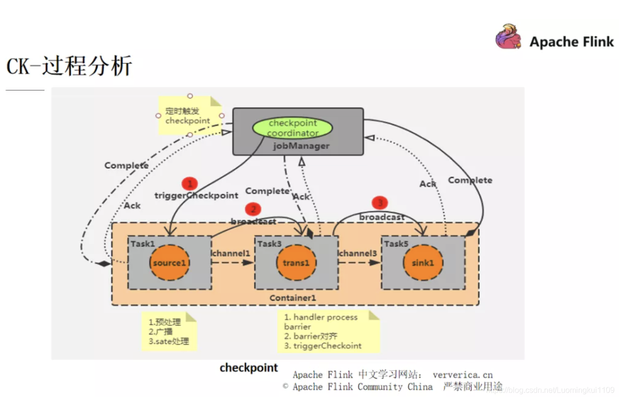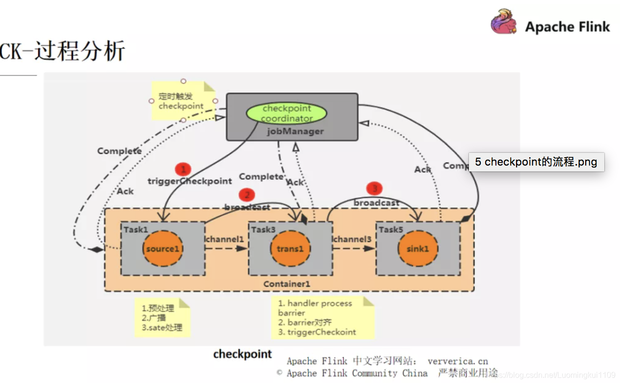 每一个 Flink 作业都会有一个 JobManager ,JobManager 里面又会有一个 checkpoint coordinator 来管理整个 checkpoint 的过程,我们可以设置一个时间间隔让 checkpoint coordinator 将一个 checkpoint 的事件发送给每一个 Container 中的 source task,也就是第一个任务(对应并行图中的 task1,task2)。