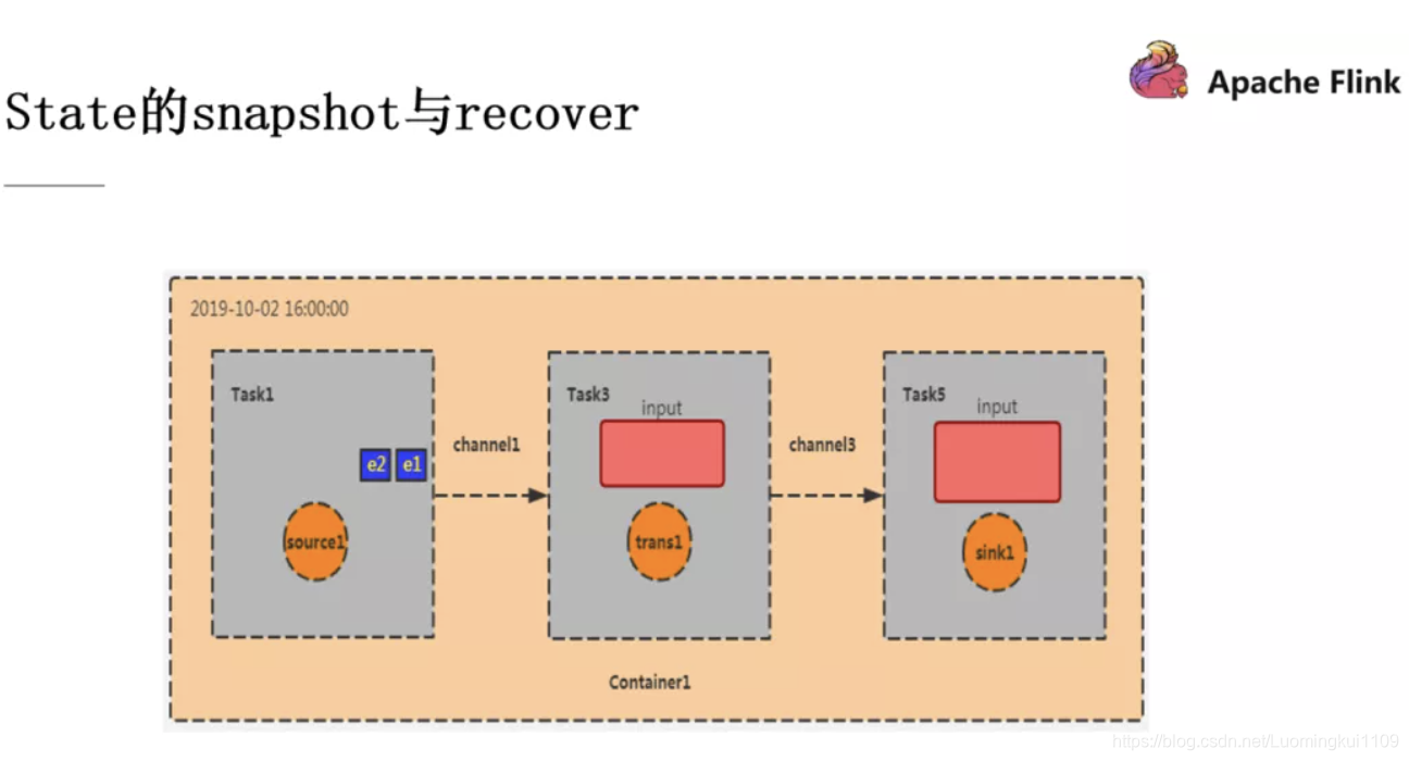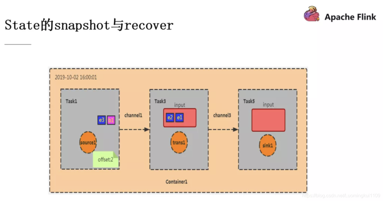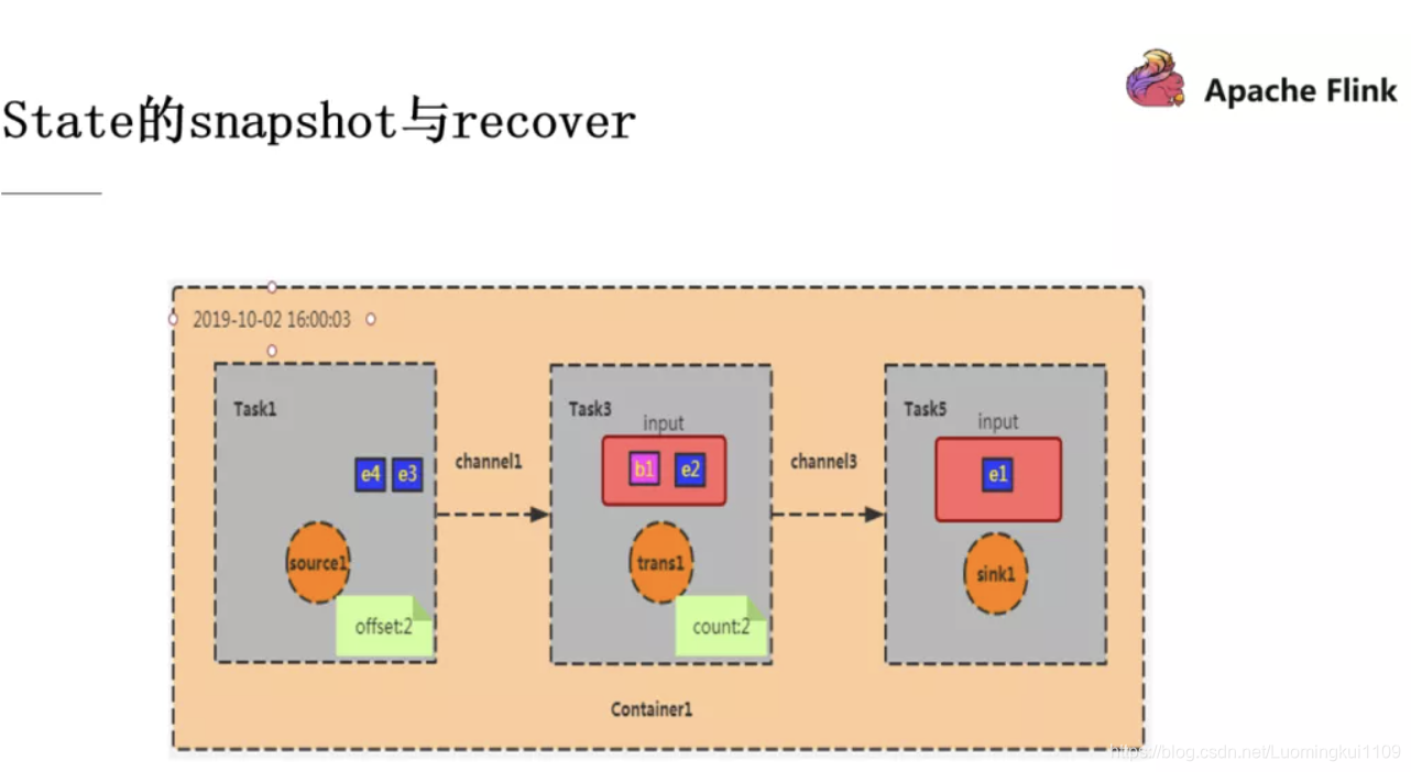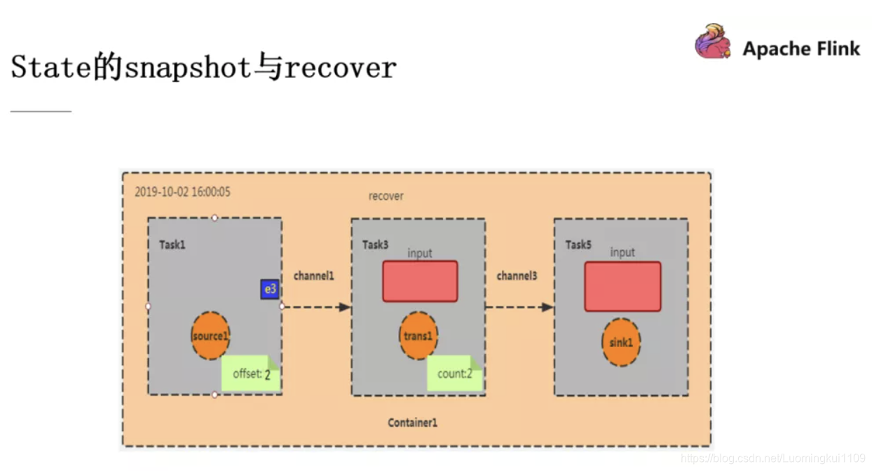 此时 source 中还会源源不断的产生数据,并产生新的 checkpoint ,但是此时如果 Container 宕机重启就需要进行数据的恢复了。刚刚完成的 checkpoint 中 offset为2,count为2,那我们就按照这个 state 进行恢复。此时 Task1 会从 e3 开始消费,这就是 Recover 操作。