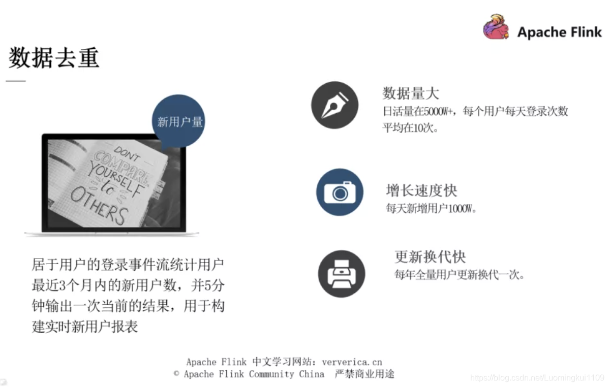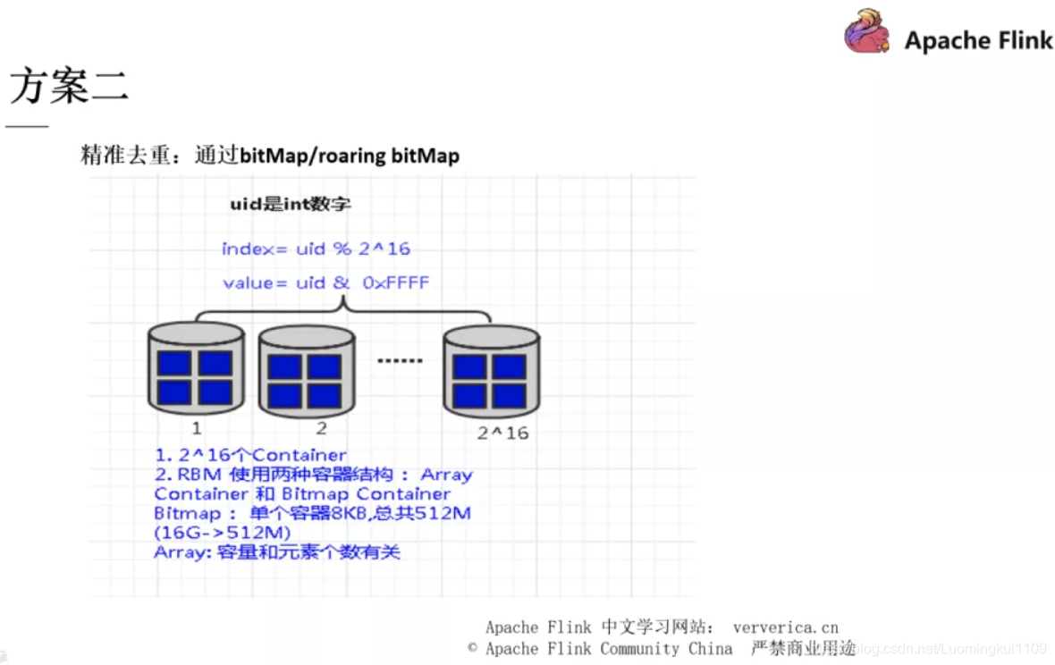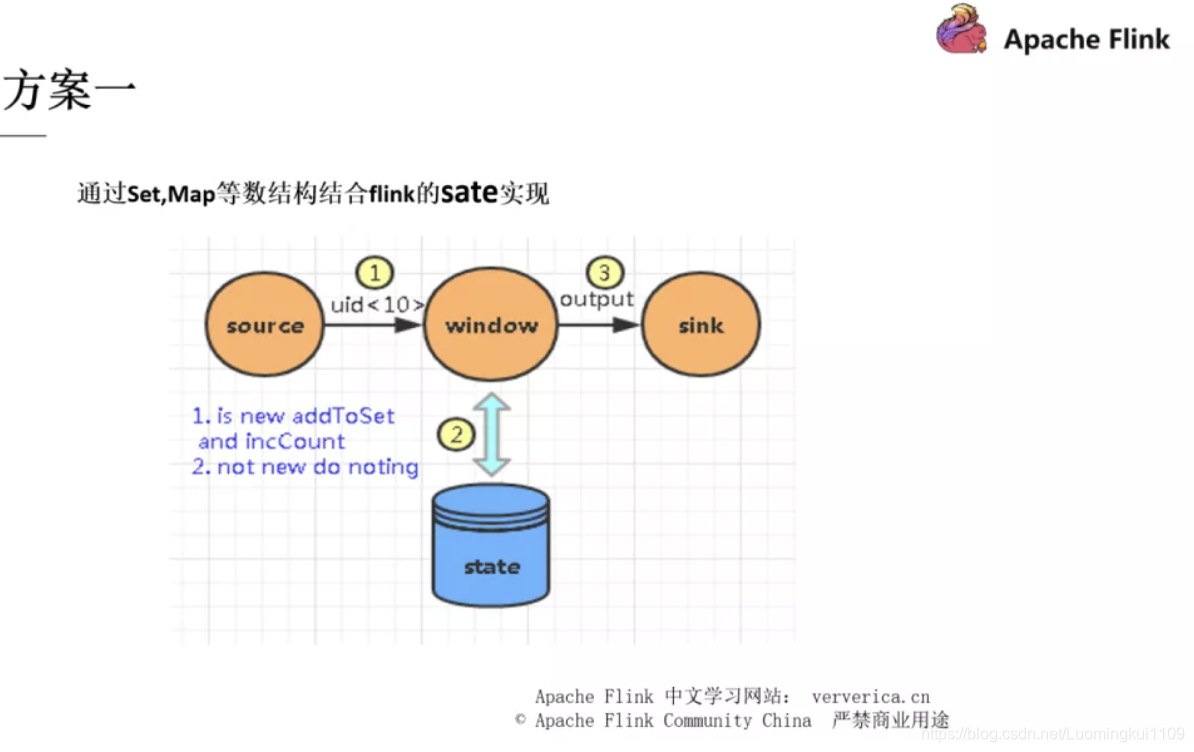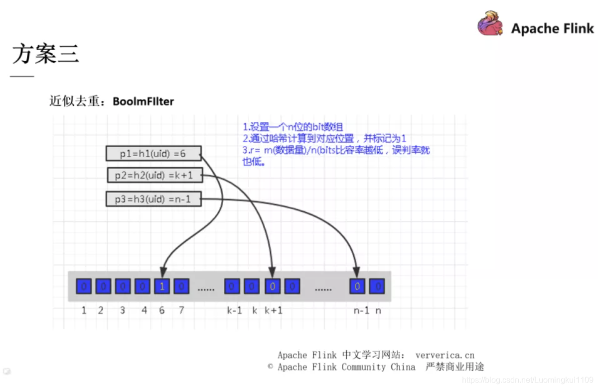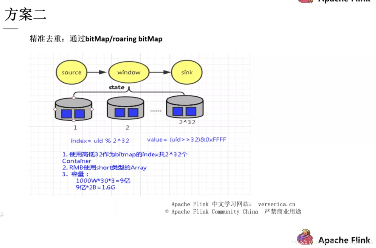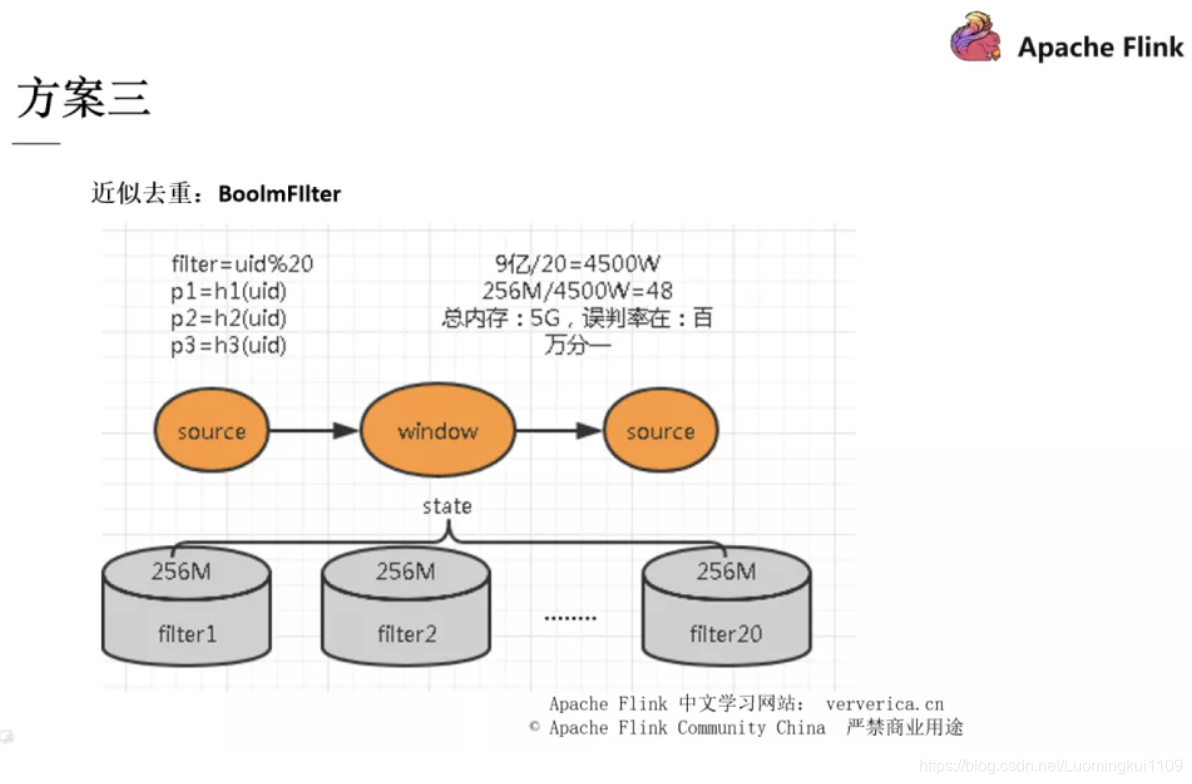 我们可以通过一些数据结构,比如 Set 或者 Map 来结合 Flink state 进行去重。但是这些去重方案会随着数据量不断增大,从而导致性能的急剧下降,比如刚刚我们分析过的 hash 冲突带来的写入性能问题,内存过大导致的 GC 问题,TaskManger 的失联问题。