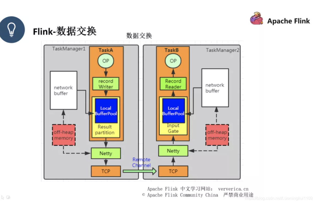因为第三种数据交换涉及到了不同的 JVM,所以会有一定的网络开销,和第二种的区别就在于它先推给了 Netty ,通过netty把数据推送到远程端的 Task 上。