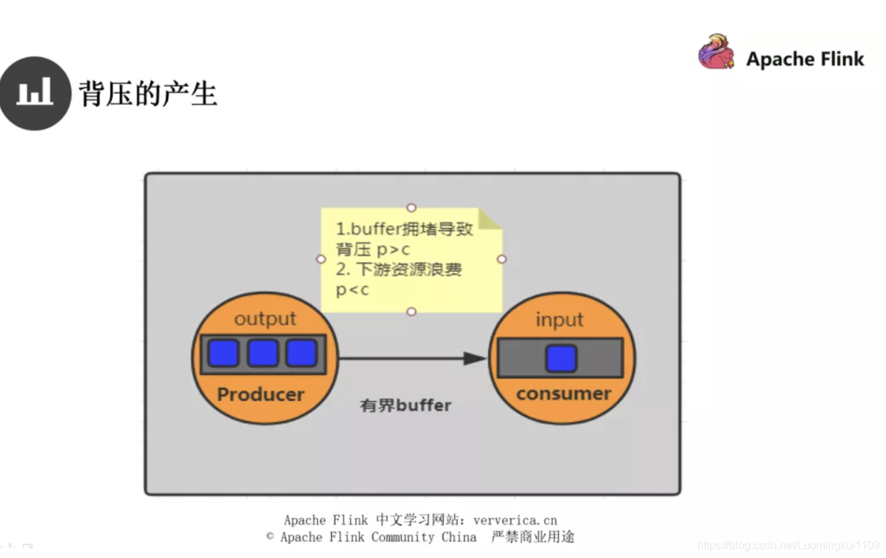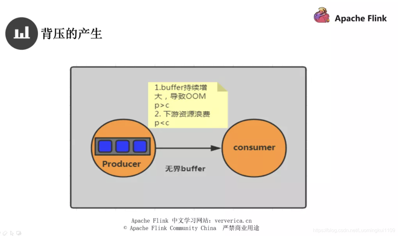 假设我现在的 Producer 是使用了无界 buffer 来进行存储,当我们的生产者生产速度远大于消费者消费的速度时,生产端的数据会因为消费端的消费能力低下而导致数据积压,最终导致 OOM 的产生。