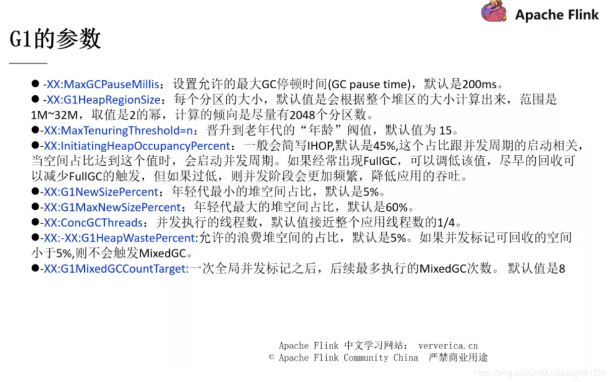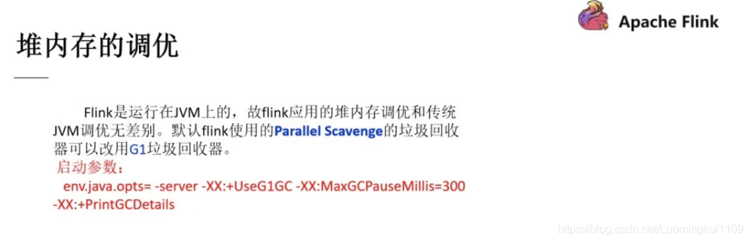 Flink 的内存结构刚刚我们已经提及到了,所以我们清楚,调优的方面主要是针对 非堆内存 Network buffer ,manager pool 和堆内存的调优,这些基本都是通过参数来进行控制的。