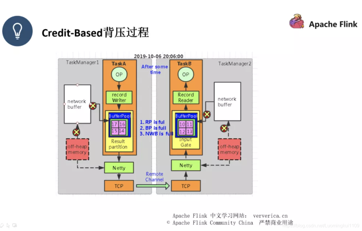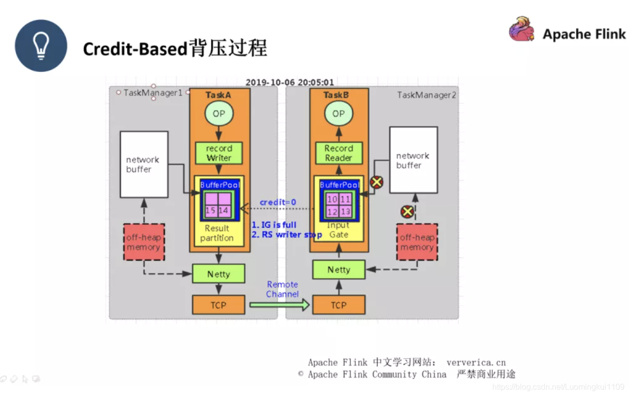 此时经过一段时间之后,TaskB中的有界 buffer 已经满了,此时 TaskB回复 credit = 0 给 TaskA,此时 channel 通道将会停止工作,TaskA 不再将数据发往 TaskB。