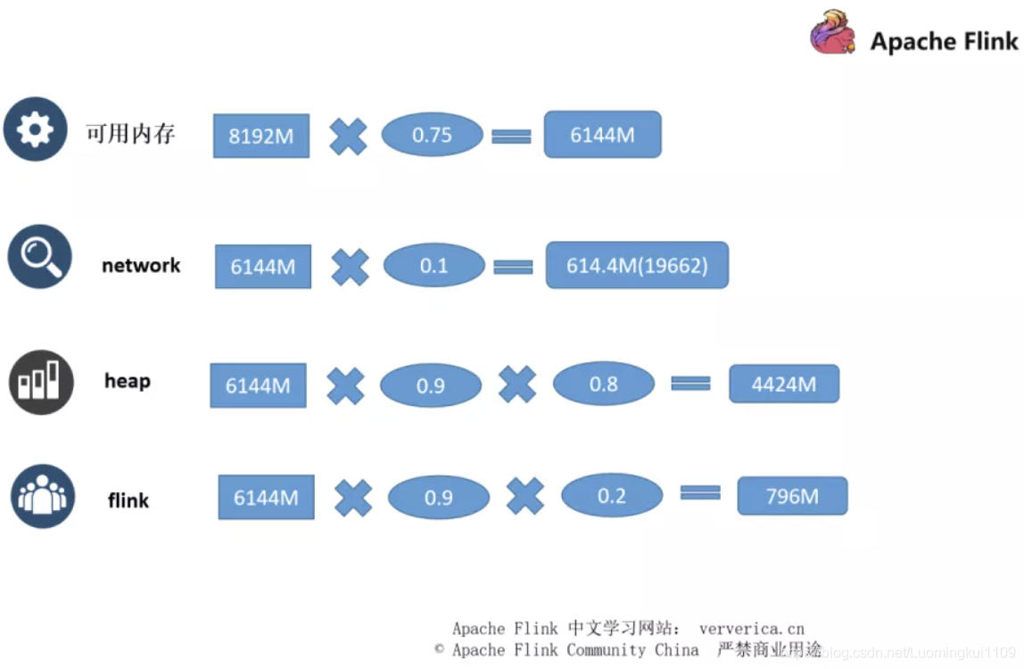 堆内/堆外内存为可用内存减去 network buffers 的部分,再乘以 0.8