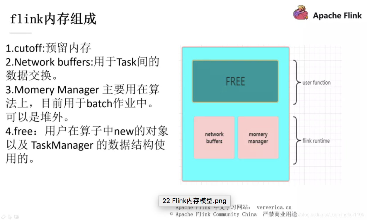 JVM 是一个非常复杂的系统,当其内存不足时会造成 OOM ,导致系统的崩溃。Flink 在拿到我们分配的内存之后会先分配一个 cutoff 预留内存,保证系统的安全性。Netword buffers 其实就是对应我们刚刚一直提到的有界 buffer,momery manager 是一个内存池,这部分的内存可以设置为堆内或者堆外的内存,当然在流式作业中我们一般设置其为堆外内存,而 Free 部分就是提供给用户使用的内存块。