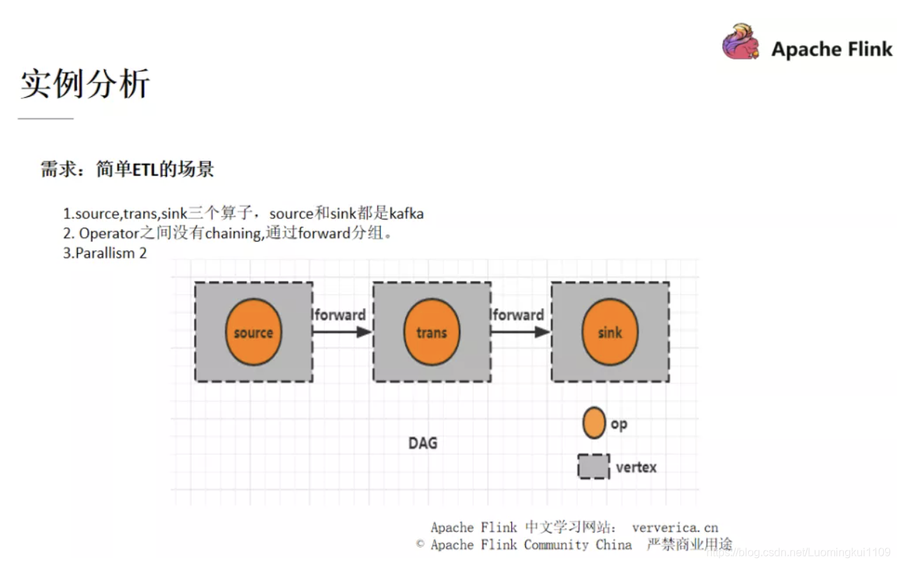 这是一个简单的 ETL 过程,首先我们把数据从 Kafka 中拿过来进行一个 trans 的转换操作,然后再发送到一个下游的 Kafka