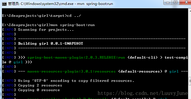 进入项目工作目录,我的在E:\Ideaprojects,输入mvn spring-boot:run
