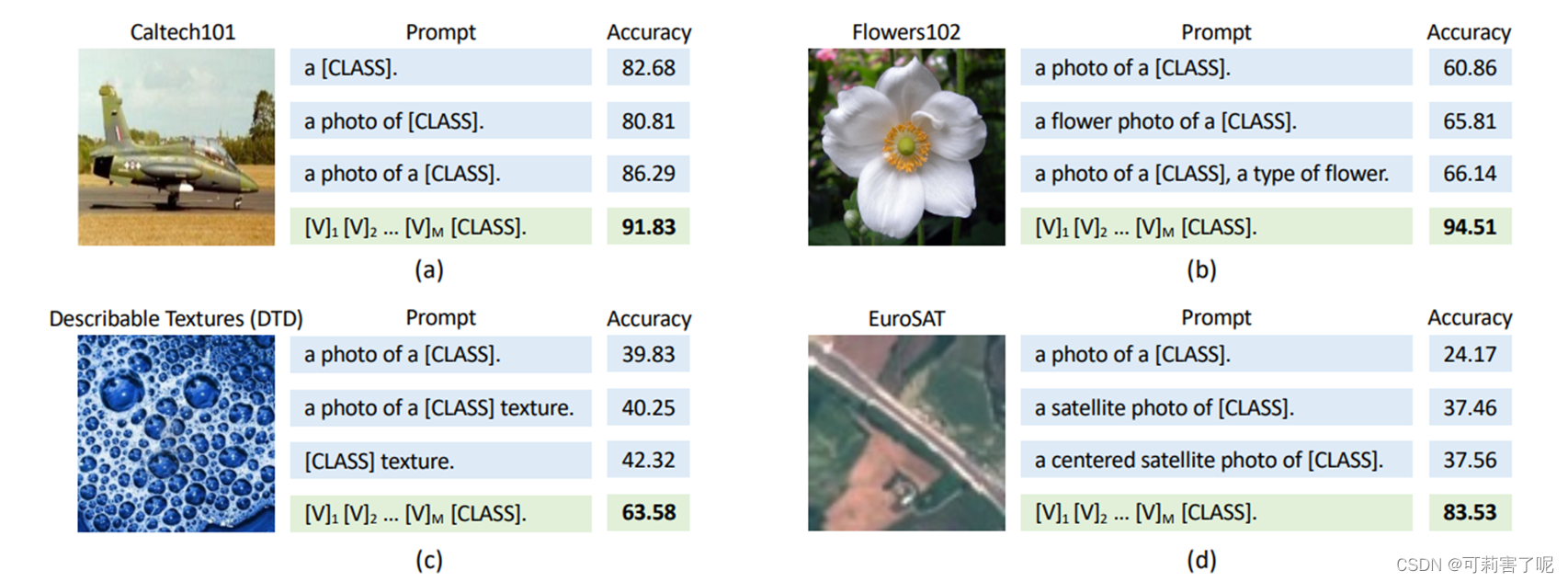 这项工作中我们表明,在实践中部署此类模型的一个主要挑战是 prompt engineering,这需要相关领域专业知识,并且非常耗时——人们需要花费大量时间在单词调优上,因为单词的微小变化可能会对性能产生巨大影响,例如在类别前有无“a”;Prompt engineering还需要关于任务的先验知识:花朵、纹理、卫星等,如下图:(而且即使是做了大量的调整,最后的精度可能不是最优的)