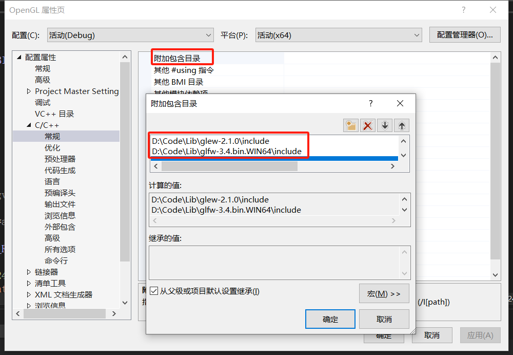 1)右击项目 -> 属性 -> C/C++ -> 常规。在 附加包含目录 中 添加上面解压的 glew 和 glfw 库中 include 目录: