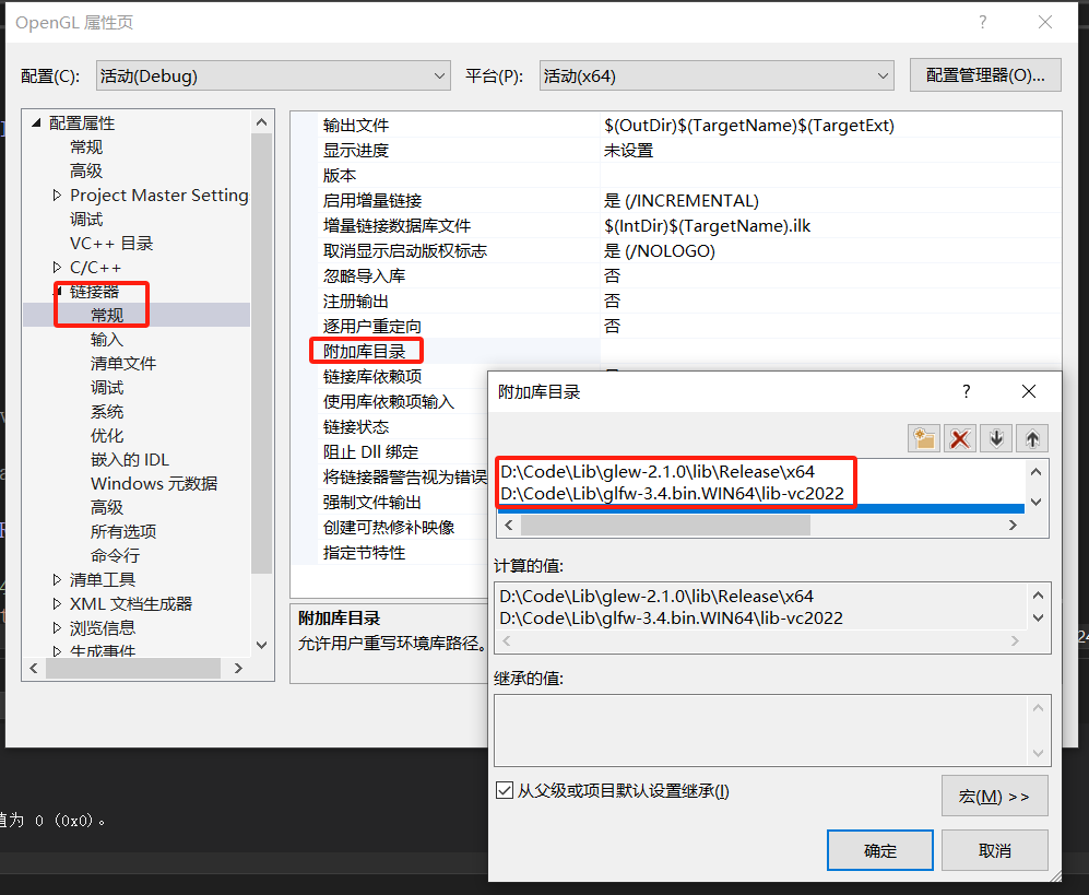 2)同样在属性的 链接器 -> 常规 -> 附加库目录 中添加 glew 和 glfw 的 lib目录: