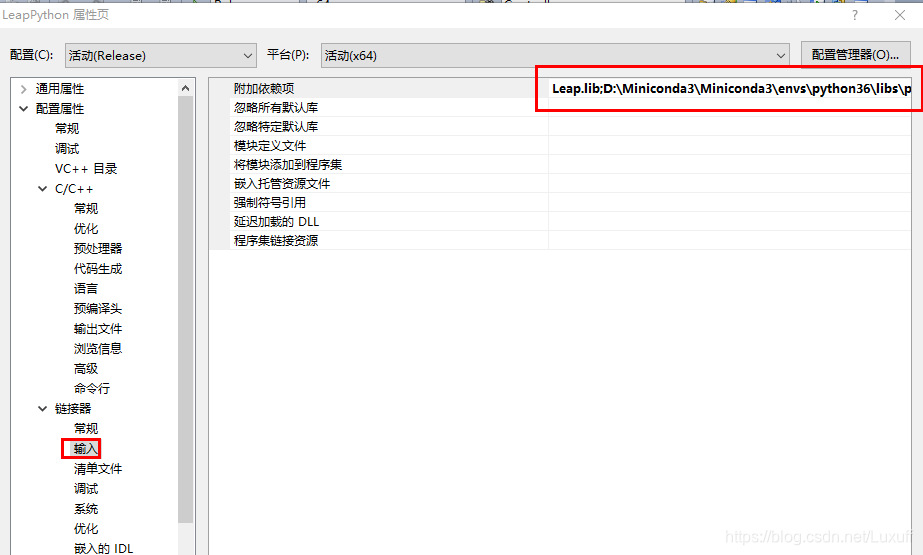 修改链接器输入配置,把Leap.lib 和自己版本 python 对应的 python lib加入附加依赖项中(由于是在原配置基础上加,别忘了逗号分隔),我的是D:\Miniconda3\Miniconda3\envs\python36\libs\python36.lib;