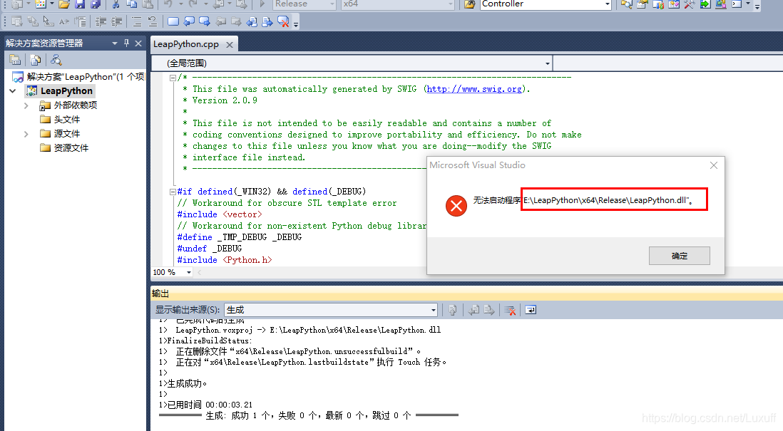 配置完成,运行会生成 LeapPython.dll 文件(如果有报错,后面会解释部分情况):