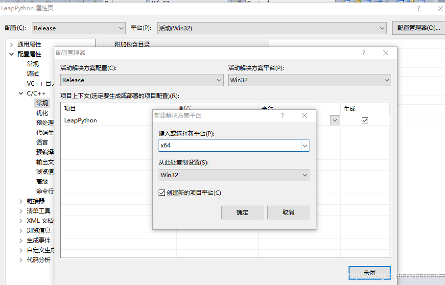 修改常规配置:目标文件名、扩展名、类型。文件名一般都是用 LeapPython ,自己使用或他人维护时都好理解,改成其他的也行。默认$(ProjectName)会用项目名作输出的文件名。