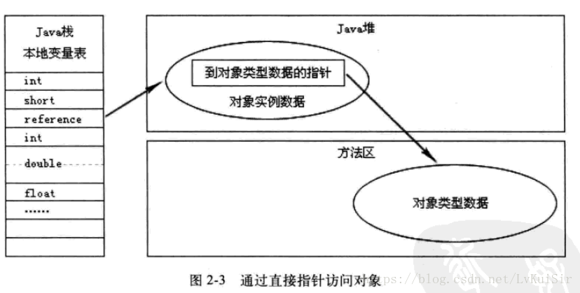 2-2 直接指针:Java堆对象的布局中就必须考虑如何放置访问类型数据的相关信息,reference中直接存储的就是对象的地址。