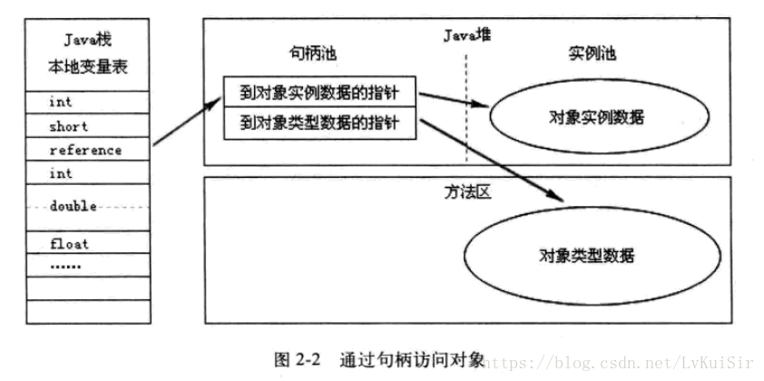 2-1 句柄访问:Java堆中划分出来一块内存作为句柄池,reference中存储的就是对象的句柄地址,而句柄中包含了对象实例数据和类型数据各自的具体地址信息。