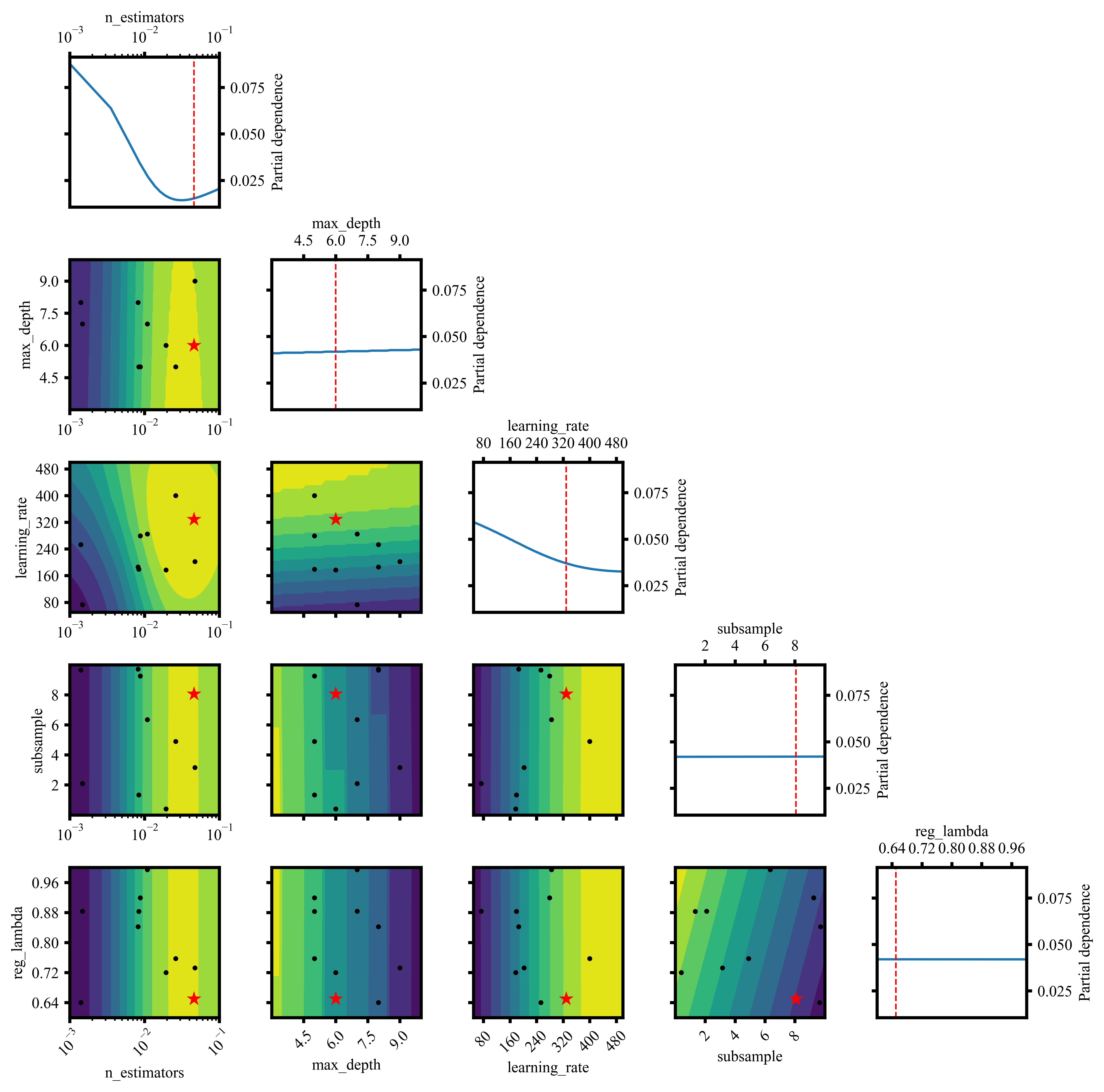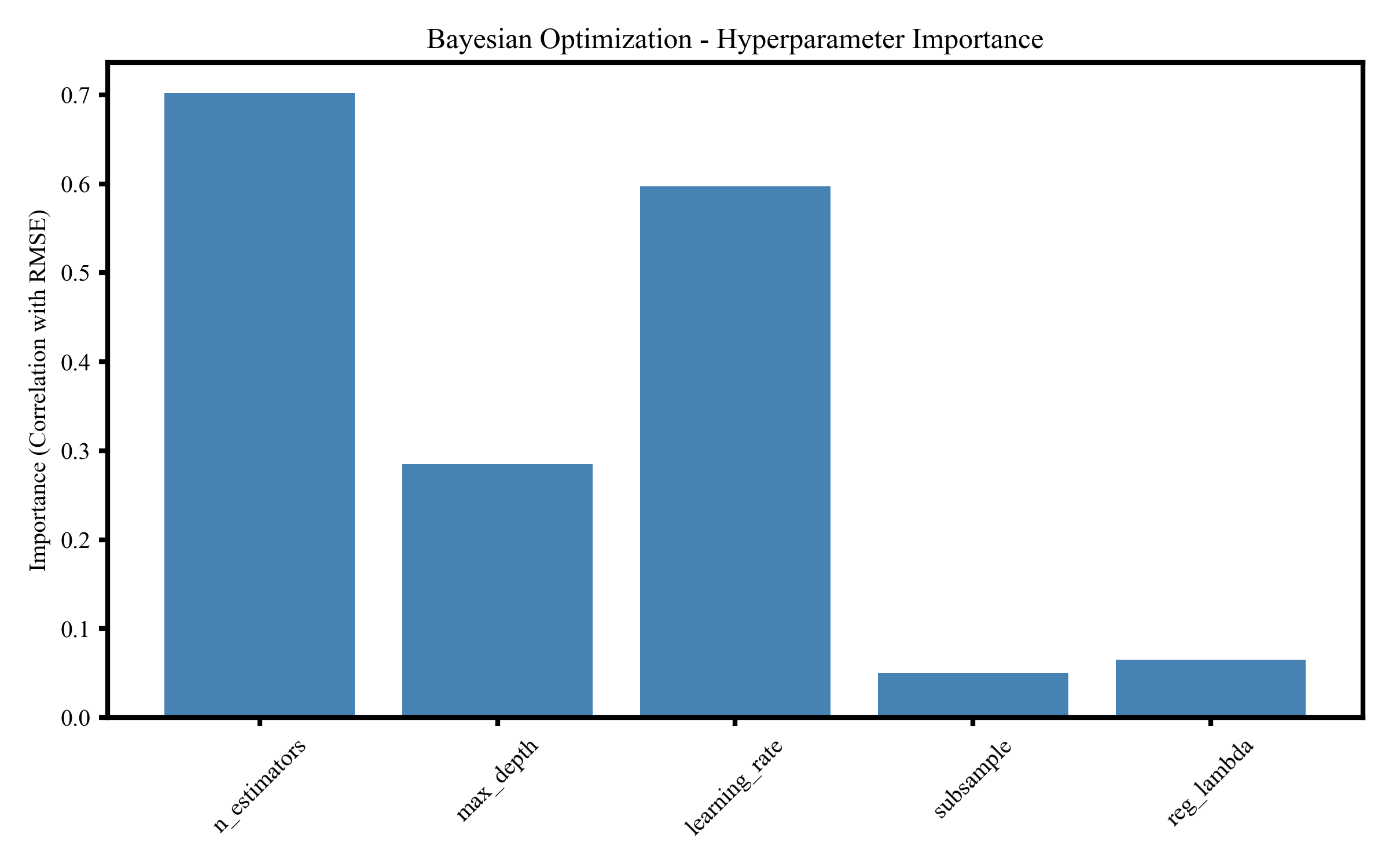 该图展示贝叶斯优化过程中各超参数的重要性,对模型误差影响最大的为 n_estimators 和 learning_rate,其次为 max_depth,而 subsample 与 reg_lambda 贡献较小,用于判断调参优先级。