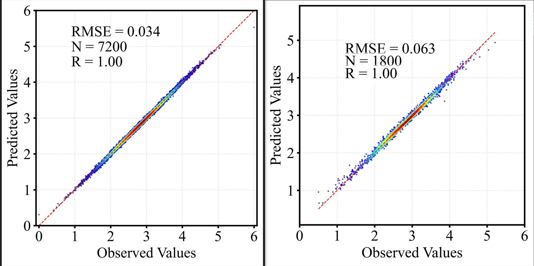 散点密度图通过颜色或亮度反映点的聚集程度,用于展示大量样本的分布特征。相比普通散点图,它能更直观地呈现高密度区域、异常点及整体趋势,常用于回归分析与模型评估。以下为训练集和测试集出图效果。