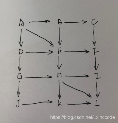 在下面有向图中找出A点到L点的最短路径